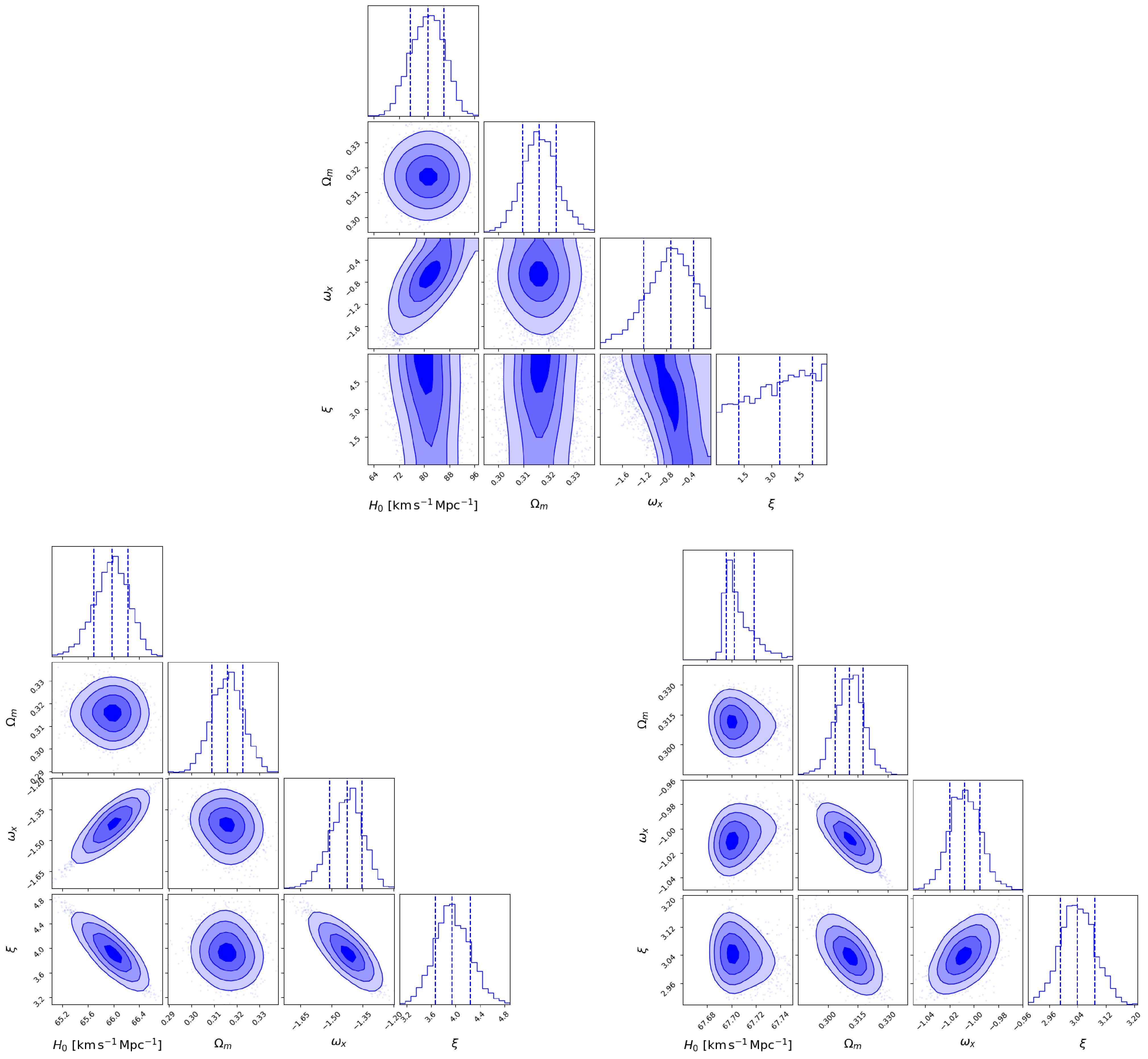 IDE, and ξIDE—using Markov Chain Monte Carlo (MCMC) methods based on 86 localized FRBs and simulated datasets containing 2,500 to 10,000 mock events. By disentangling the contributions to the observed DMs from the Milky Way, host galaxies, and intergalactic medium (IGM), key cosmological parameters are constrained, including the Hubble constant (\begin{document}$ H_{0} $\end{document} ![]()