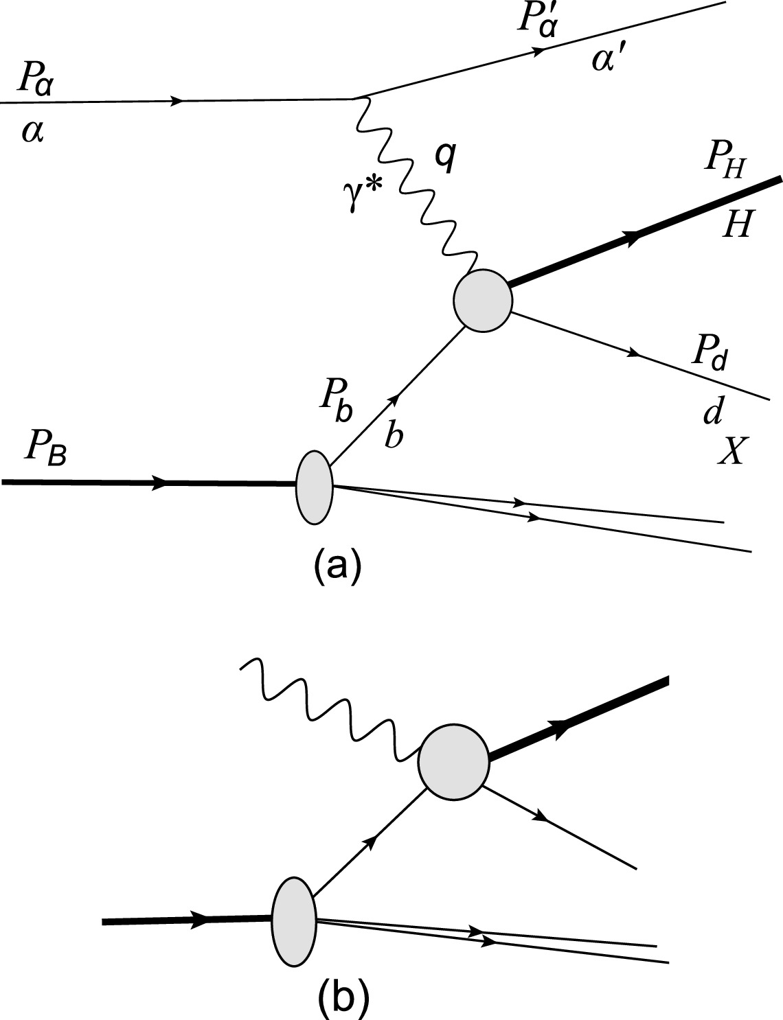 $ s_{\alpha b}=(p_{\alpha}+p_{b})^{2} $ and$ \hat{s}=(q+p_{b})^{2} $ are the squared energies in the α-b and$ \gamma^{*} $ -b partonic processes, respectively.$ p_{\text{CM}} $ and$ \hat{p}_{\text{CM}} $ are the corresponding momenta. Details of these terms are presented in Appendix B.By integrating over the phase space volume Π, Eq. (8) includes the term