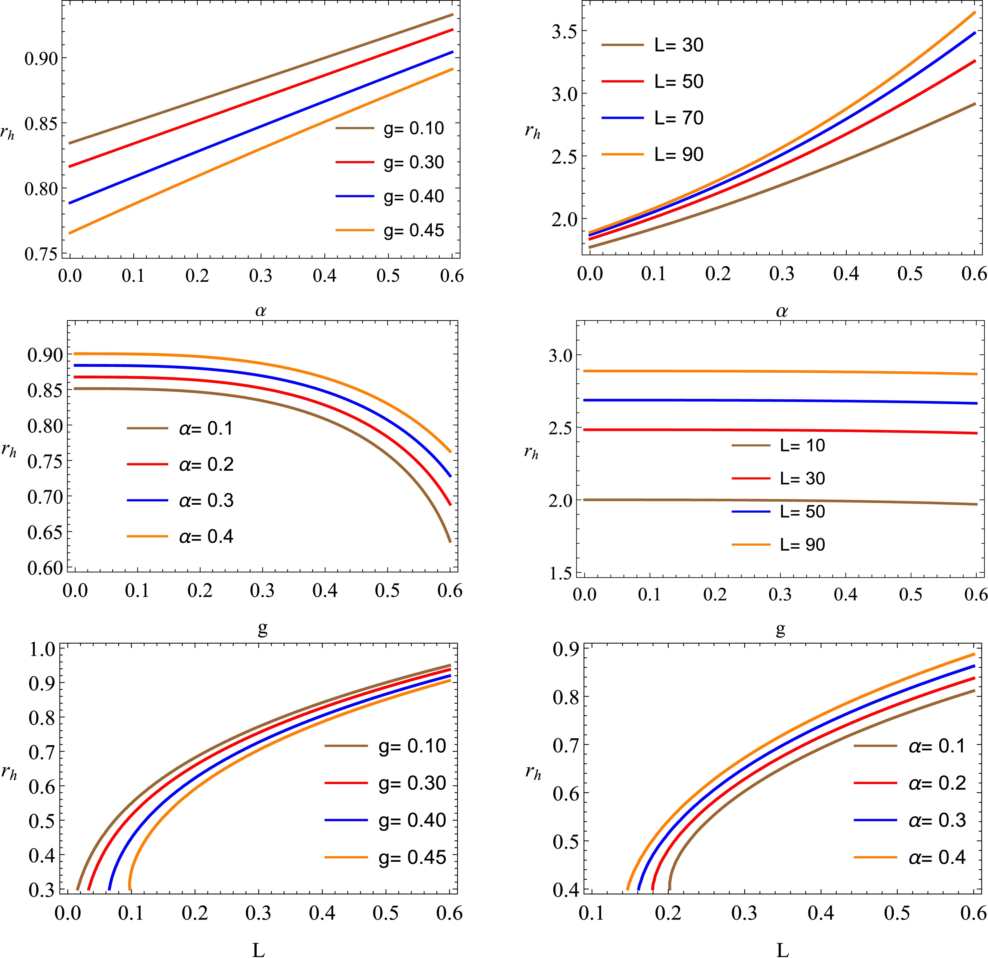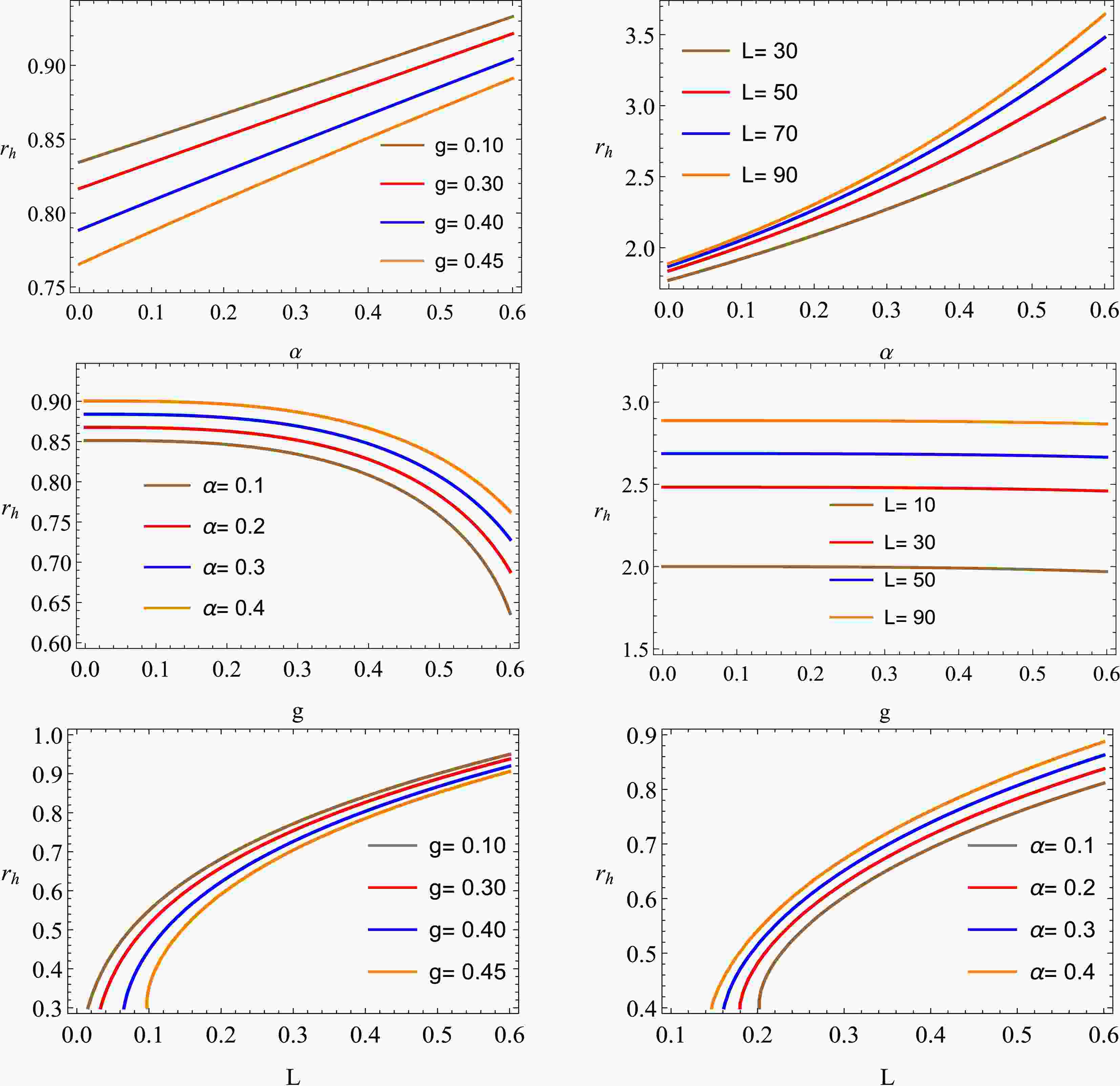 $ f(r) = 0 $ , in the limit$ r \gg r_h $ and with$ S \to 1 $ , where the value of$ 2M $ is considered, the horizon is computed as follows. This leads to the stretched NH solution as$ \begin{aligned}[b] (1-S)^{\eta_{1}}\simeq& \bigg[\frac{r_{h}}{r}\frac{r^2_{h}(1+g^3_{\ast})(1+L^2_{\ast})}{r^2}\bigg]^{\eta_{1}} \\ \simeq& \bigg[\frac{r_{h}}{r}\frac{r^2_{h}(1+g^3_{\ast})(1+L^2_{\ast})}{r^2}\bigg]^{-l}, \end{aligned} $