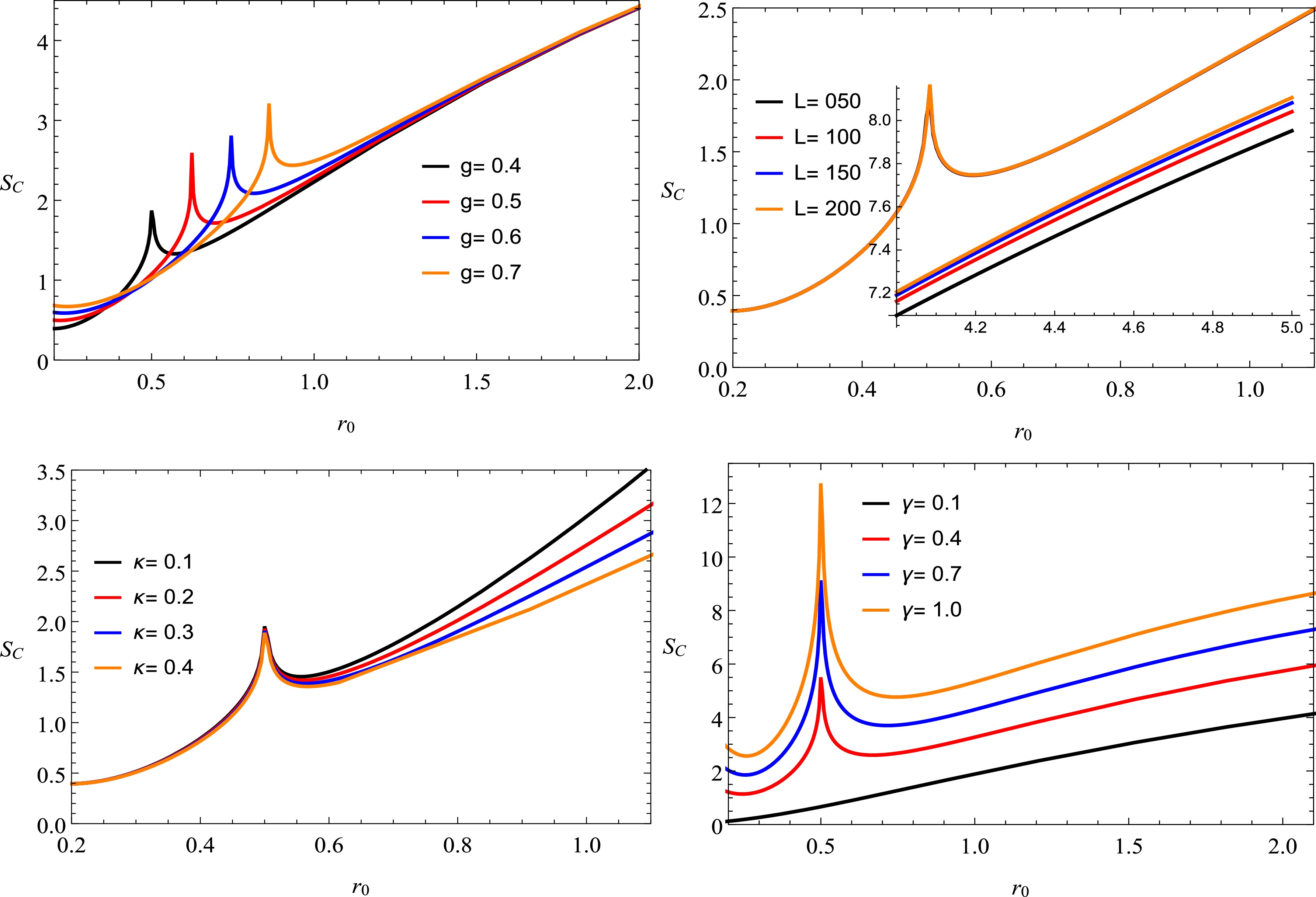 $ S_C $ is plotted for the different values of the correction parameter in Fig. (6), where$ \gamma=0 $ for large BHs, and$ \gamma=0.1,\; 0.4,\;0.7,\; \text{ and } \;1.0 $ for small BHs ($ 0 < \gamma < 1 $ ). One can see that, for large BHs, no fluctuations are observed. Moreover, corrected entropy increases by increasing parameters$ g,\;L,\;\kappa,\;\gamma $ , whereas no variations are observed for increasing values of α as the expression is independent of α. -