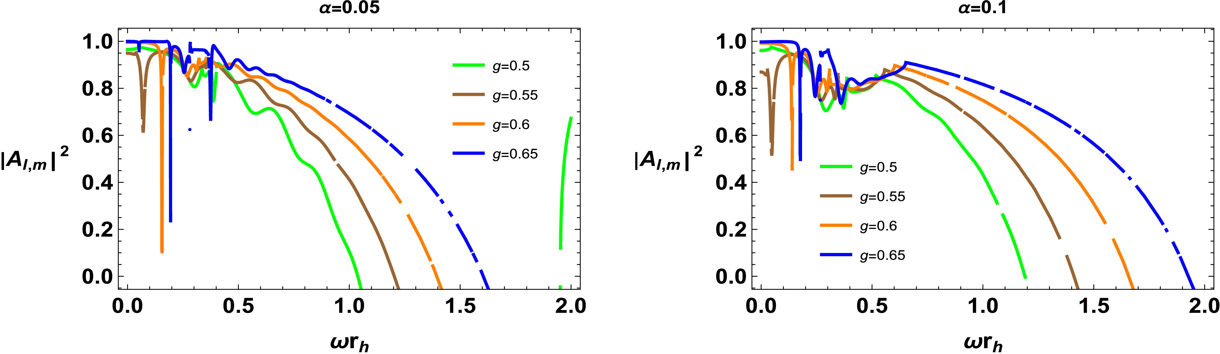 (72) The absorption rate of the scalar field varies along the radial direction, as shown in Figs. 9−11. After the fluctuations, the absorption rate decreases with an increase in the cloud of strings parameter. In addition, the charge of the geometry affects the absorption rate with a decrease observed with an increase in the BH charge , as shown in Fig. 10. For larger values of L, the absorption rate fluctuates initially and then exhibits smooth behavior as the frequency rises. It is important to note that the absorption rate is affected by the parameters a and g (Fig. 11). For smaller values of g, the fluctuation is less pronounced at lower frequencies. The absorption rate decreases with increasing frequency and is further affected by the parameters of the BH.