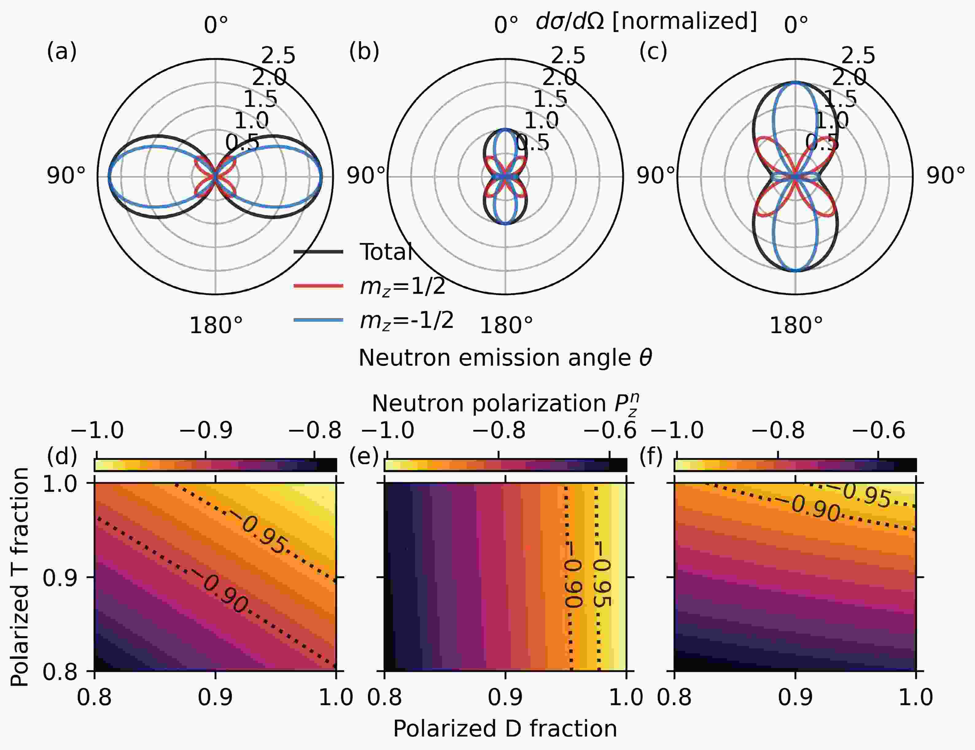 $ \dfrac{{\rm d}\sigma}{{\rm d}\Omega} $ ,$ \dfrac{{\rm d}\sigma}{{\rm d}\Omega}^+ $ ,$ \dfrac{{\rm d}\sigma}{{\rm d}\Omega}^- $ for tritons fully polarized in the$ m_z=1/2 $ state and deuterons polarized in the$ m_z=1 $ state (parallel polarization case). The polar angle of maximum neutron emission is$ \theta=90^\circ $ , and the maximum differential cross-section is 2.25 times the unpolarized differential cross-section$ \sigma_0/4\pi $ . The emitted neutrons near$ \theta=90^\circ $ are mostly in spin$ m_z=-1/2 $ state. When tritons are polarized in the$ m_z=1/2 $ state and deuterons are polarized in the$ m_z=-1 $ state (antiparallel polarization case), the polar angles of maximum neutron emission are$ \theta=0^\circ $ and$ \theta=180^\circ $ , as shown in Fig. 1(b). The maximum differential cross-section is equal to the unpolarized differential cross-section. The emitted neutrons near$ \theta=0^\circ $ and$ \theta=180^\circ $ are polarized in the$ m_z=-1/2 $ state. For tritons polarized in the$ m_z=-1/2 $ state and deuterons polarized in the$ m_z=0 $ state (perpendicular polarization case), the angular distributions are similar to those of the antiparallel polarization case, as depicted in Fig. 1(c). The maximum differential cross-section is 2 times the unpolarized one. In experiments, the DT fuels are not fully polarized, and the self-generated magnetic fields can lead to the depolarization of the fuel during the implosion. Equations (1) and (2) are used to obtain the neutron polarizations for different polarized deuteron and triton fractions. The neutron polarization is defined as the difference between neutron fractions in different spin states,$ p_z^n=n_{1/2}-n_{-1/2} $ , where$ n_{\pm1/2} $ are the fractions of neutrons in the$ m_z=\pm1/2 $ states, respectively. The neutron polarization at$ \theta=90^\circ $ for the parallel polarization case is shown in Fig. 1(d), and the neutron polarizations at$ \theta=0^\circ $ for the antiparallel and perpendicular polarization cases are shown in Figs. 1(e) and 1(f), respectively. The dashed lines in Figs. 1(e)−(f) show the boundaries of neutron polarization below –0.90 and –0.95. The parallel polarization case occupies larger areas of high neutron polarization in the parameter space than the antiparallel and perpendicular polarization cases, indicating higher tolerances for imperfect initial fuel polarization and depolarization.