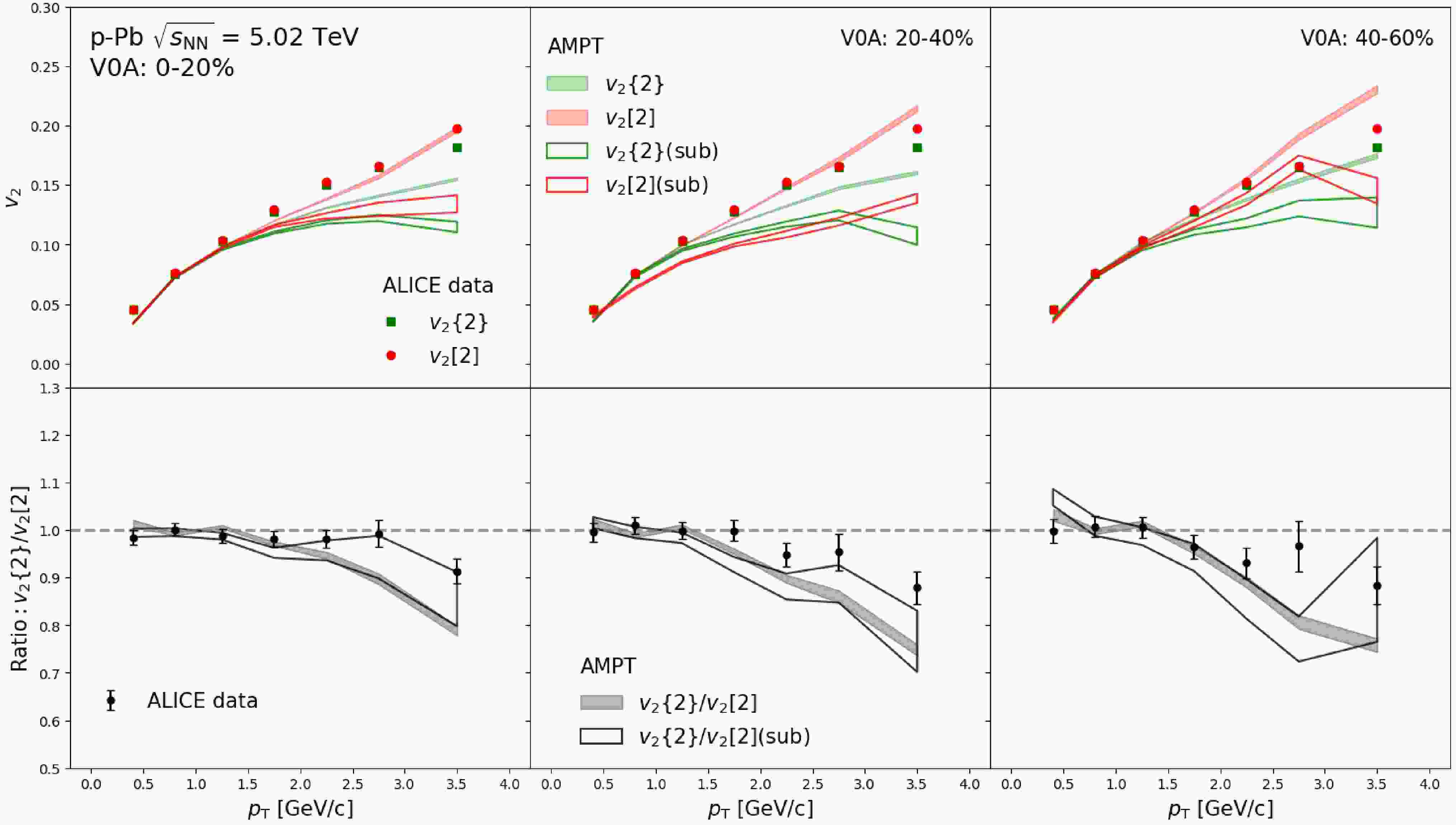 $ v_{2}\{2\}$ and$ v_{2}[2]$ as a function of$p_{\mathrm{T}} $ and their ratio obtained from the AMPT model in 0–20%, 20%–40%, and 40%–60% p–Pb collisions at 5.02 TeV, in comparison of those obtained via ALICE measurements [41]. Results with the nonflow subtraction obtained from the AMPT model are also shown.Figure 2 shows the