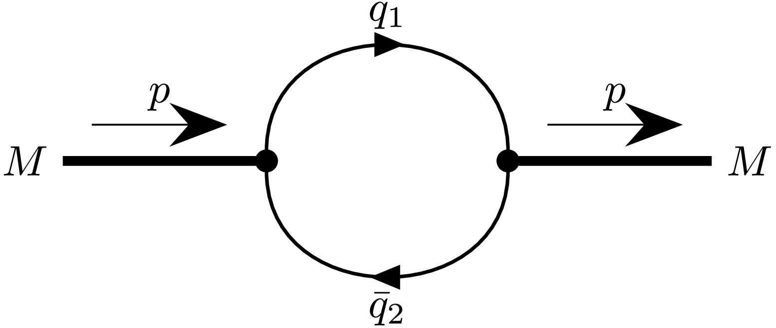 $ Z_M $ represents the wave function renormalization constant of the meson and$ \Pi'_M $ represents the derivative of the mass function of the meson. The meson mass function$ \Pi_M(p) $ is calculated using a one-loop Feynman diagram representing the self-energy of the meson (see Fig. 1). The specific forms for pseudoscalar$ (\Pi_P) $ and vector$ (\Pi_V) $ mesons read$\begin{aligned}[b] \Pi_P(p) =\;& 3g_P^2 \int \frac{{\rm d}k}{(2\pi)^4i}\,\widetilde\Phi^2_P \left(-k^2\right) \\&\times \rm{tr}\left[ S_1(k+w_1p)\gamma^5 S_2(k-w_2p)\gamma^5 \right],\end{aligned} $