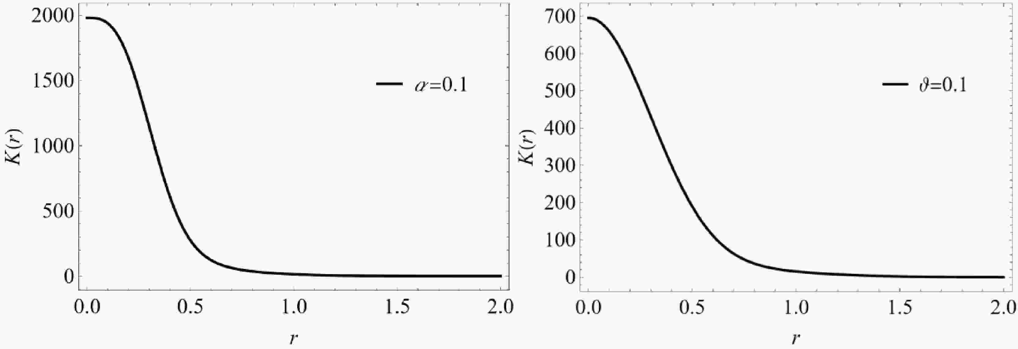 $r \to 0$ , we have$ \mathop {\lim }\limits_{r \to 0} \left( {{\mathcal{R}_{\mu \nu \tau \sigma }}{\mathcal{R}^{\mu \nu \tau \sigma }}} \right) = \frac{{2M\left( {10M - 3\sqrt \pi {\vartheta ^{{3 \mathord{\left/ {\vphantom {3 2}} \right. } 2}}}} \right)}}{{9\pi {\vartheta ^3}}}, $