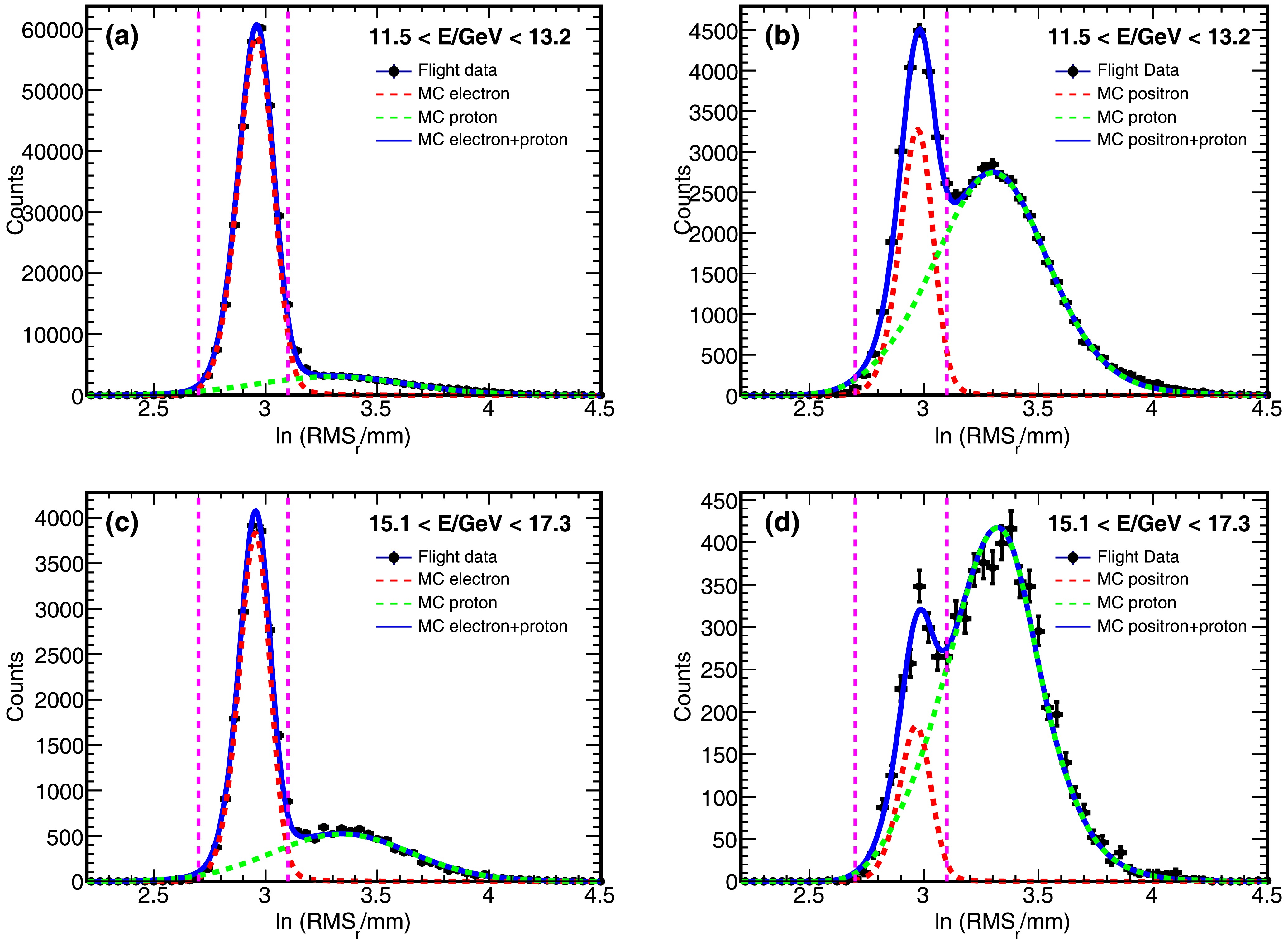 $ \ln (RMS_r/\text{mm}) $ for events with the energy ranges 11.5−13.2 GeV (a,b) and 15.1−17.3 GeV (c,d). The flight data are shown as black points. The probability density functions represent the distributions of the best-fit electron (a,c)/positron(b,d) MC (red), proton MC (green), and electron/positron + proton MC (blue). The vertical dashed lines indicate the$ \ln (RMS_r/\text{mm}) $ range used to select the electron/positron candidate events.Background estimation—There are three components contributing to the background of the candidate electrons/positrons: (a) residual CR protons, (b) the secondary electrons/positrons from the interactions between the CR nuclei and Earth's atmosphere, and (c) the residual electrons in the candidate positrons and the residual positrons in the candidate electrons owing to the limited angular resolution of DAMPE (