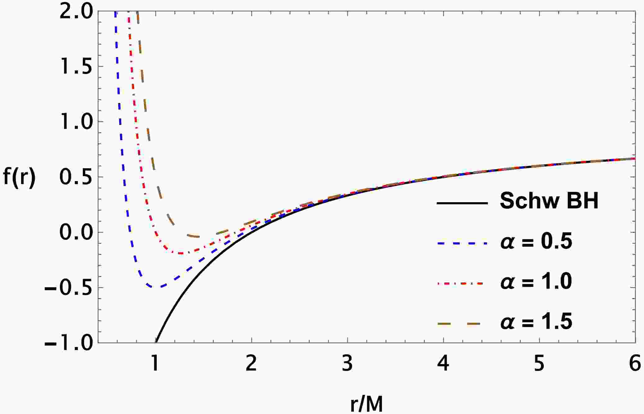$ \begin{eqnarray} f(r)=\left(1-\frac{2G M}{r}+\frac{\alpha G^2M^2}{r^4}\right)\, , \end{eqnarray} $