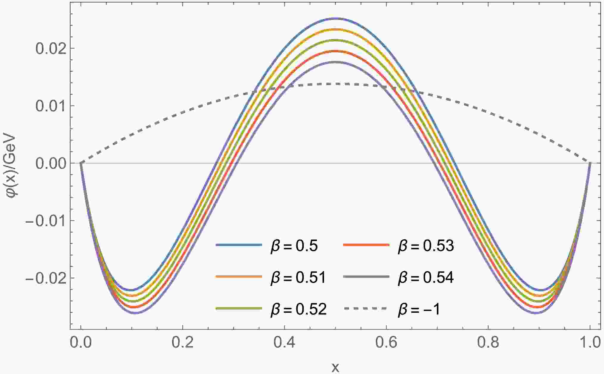 $ u_2 $ , we can obtain the following expression of DA:$ \begin{aligned}[b] \varphi(x)=\;&-\frac{9M}{4\pi^{2}{\cal{N}}}\left[(1+2\beta)x(1-x)\right.\\ &\left.+(1+\beta)(x^{2}\ln x+(1-x)^{2}\ln(1-x))\right]. \end{aligned} $