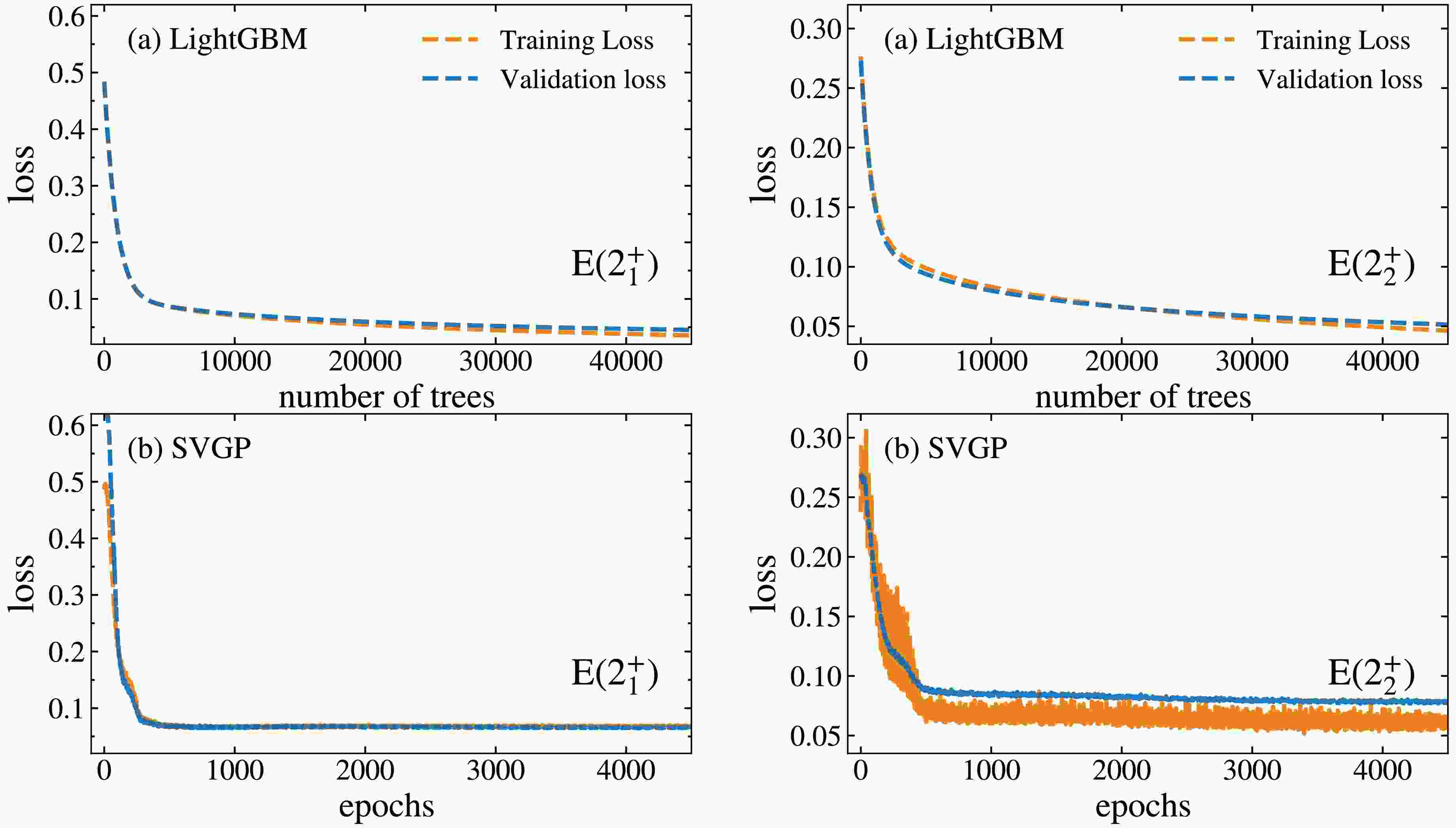 Figure 1.  (color online) Learning curves of the LightGBM and SVGP models for the prediction of the excitation energies of $ 2^+_1 $ and $ 2^+_2 $ states illustrate the evolution of the loss function with the number of training iterations (i.e., number of decision trees or training epochs).