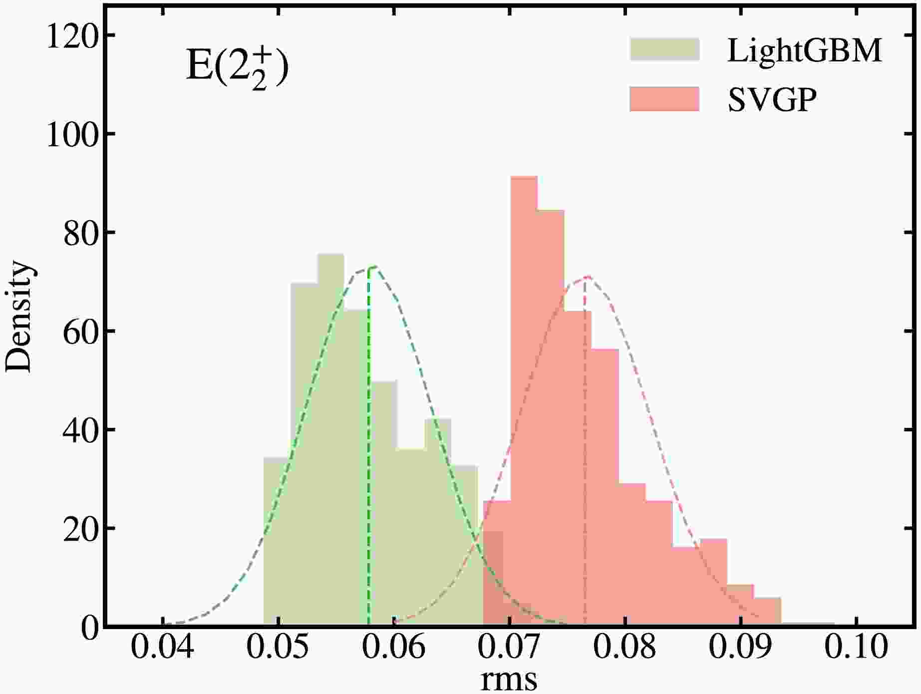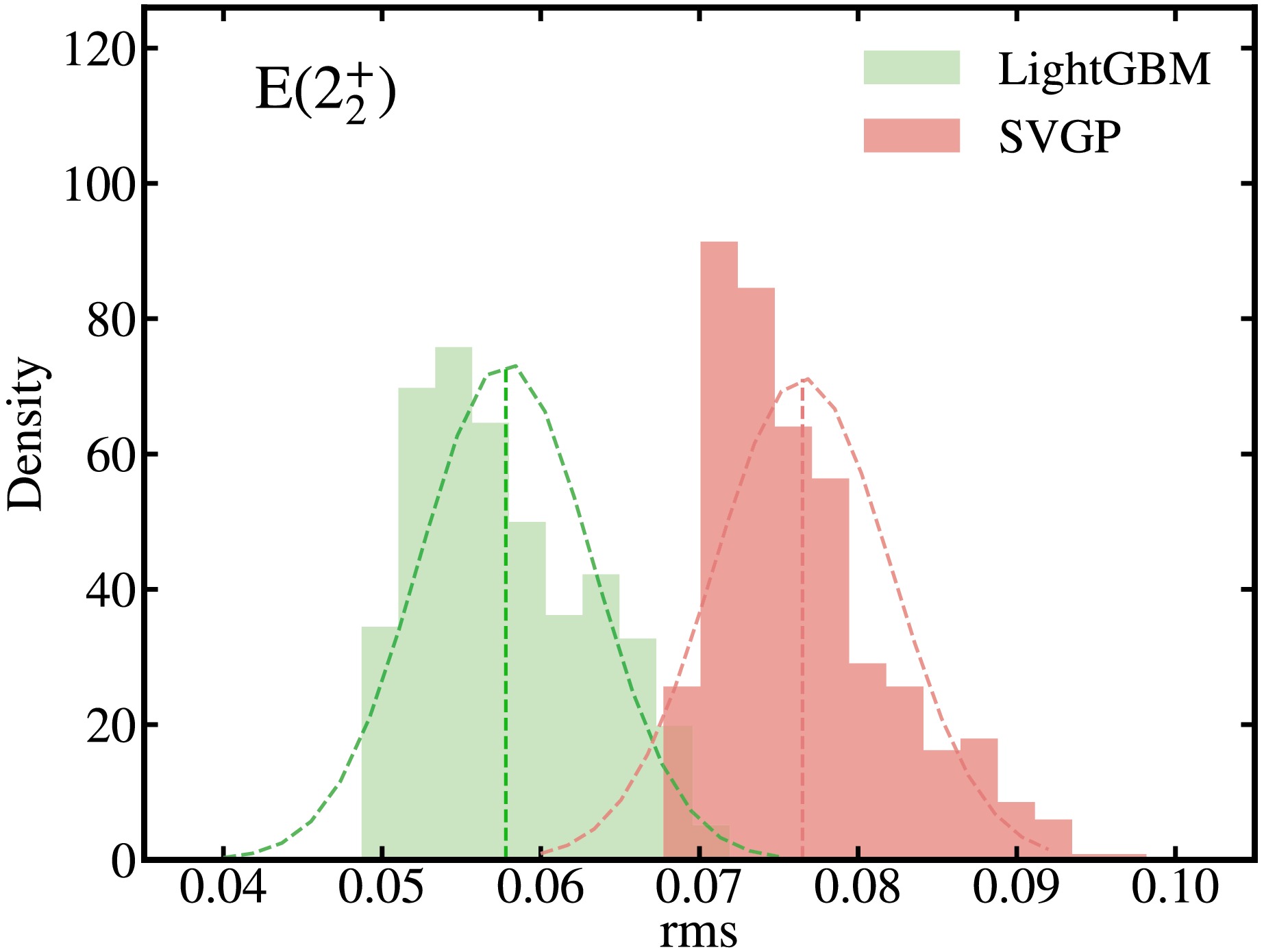 Performance of SVGP and LightGBM in the study of $ E(2_2^+) $. Prior to this work, the excitation energies of $ 2_2^+ $ states remained unexplored using machine learning methodologies. In the current study, we employed LightGBM and SVGP to analyze $ E(2_2^+) $ using the $ M16 $ feature space. Fig. 2 illustrates the density distribution of the rms value for the validation dataset of the excitation energies of the $ 2_2^+ $ states using LightGBM and SVGP, respectively. The rms for the validation data points predicted by LightGBM and SVGP were 0.058(5), and 0.077(6), respectively. This means that LightGBM and SVGP reproduce the experimental data within a factor of $ 10^{0.058} = 1.14 $ and $ 10^{0.077} = 1.19 $, respectively. These results are better than that most of the traditional theoretical models. Similar to the study of $ E(2_1^+) $, the decision tree-based LightGBM outperforms SVGP in predicting $ E(2_2^+) $. For the reader's convenience, we have summarized the current results in Table 1. It is worth noting that although the predictions from LightGBM are deterministic under fixed training data and parameters, the reported validation rms error (e.g., $ 0.058 \pm 0.005 $) results from repeated random partitioning of the training data. Specifically, we performed 500 independent training runs, each using a randomly selected 80% of the data for training and the remaining 20% for validation. The reported mean value of rms and standard deviation are calculated across these runs to assess the model’s stability and generalization under different data splits.
