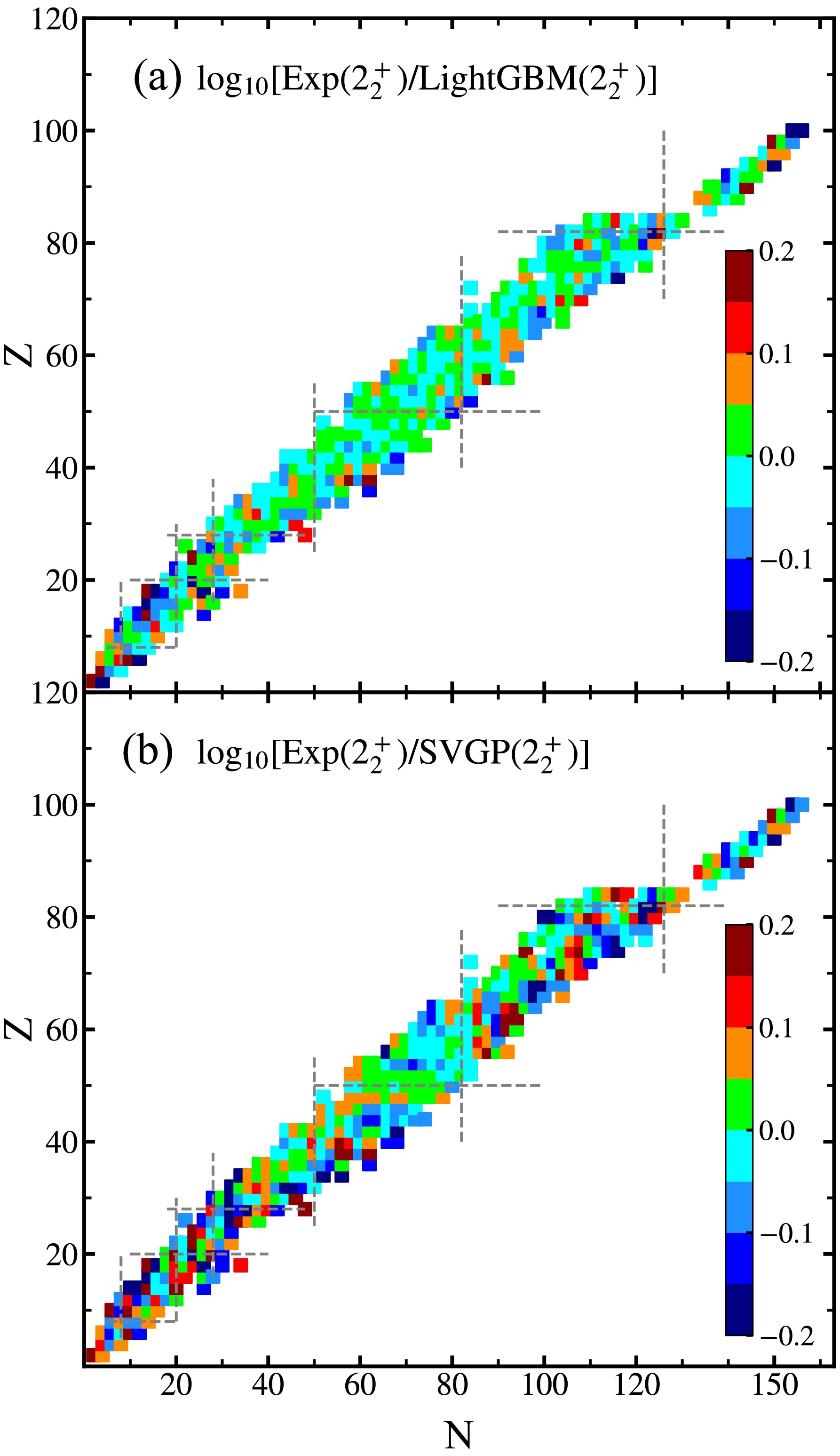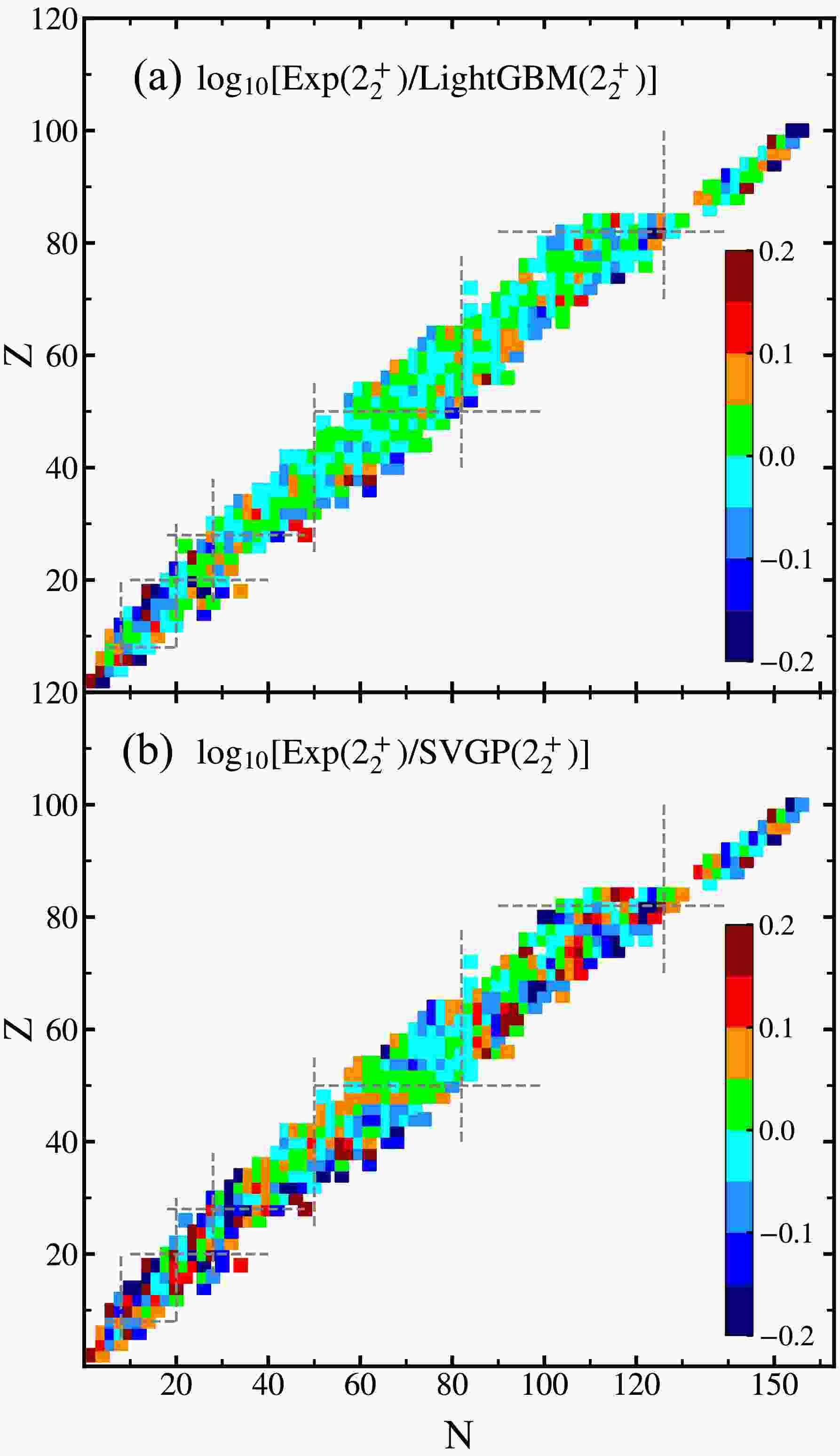 Performance of SVGP and LightGBM on the newly reported data. In addition to best reproduce the known $ E(2_1^+) $ and $ E(2_2^+) $ data across the nuclear landscape, one of important objective of this work is to apply the algorithms in the extrapolated region where experimental measurements are absent or currently inaccessible. In present work, we initially evaluate the extrapolation abilities of the LightGBM and SVGP algorithms by venturing beyond the training area using new data points. Fig. 8 compares a total of 12 newly reported data from 2020 to the present with the predictions from LightGBM and SVGP [7181]. These newly measured data points were not included in the training process. It is evident that LightGBM and SVGP demonstrate reasonable predictive capabilities outside the training region for these nuclei, showing good agreement within the uncertainty. This favorable outcome could be attributed to the newly measured nuclei, which differ by up to 2 nucleons from their nearest neighbors in the (Z, N) space of the training set, with a maximum difference of 4 for the $ 2_1^+ $ states. Additionally, although present results indicate that the employed machine learning models maintain strong generalization capability and stable predictive performance for the nuclei not so close drip lines and where neighbors exist, it is challenging to draw conclusions regarding the robustness of drip-line nuclei, where no close neighbors are present. This difficulty arises due to the weakly bound or unbound nature of these nuclei, which may lead to abnormal behavior. Such strong performance in these extrapolation tests instills confidence in the model's predictions for nearby nuclei that have not yet been experimentally investigated. However, as also indicated in Fig. 8, there are slightly discrepancies between the ML predictions and the experimental data for the $ ^{110} {\rm{Zr}}$. This differences may arise from the tentative assignment of spin and parity from the experimental side, or the enhanced triaxial deformation that the ML may not have adequately captured [75]. A attempt to include the triaxial deformation (γ) information from the sophisticated nuclear models in the feature space may enhance the prediction capability. It should be mentioned that all target values used for training were sourced from the National Nuclear Data Center [61] in this study. However, since experimental data on $ E(2_2^+) $ and $ E(2_1^+) $ are intrinsically limited (covering only a few hundred nuclei), we did not apply special filtering for cases with uncertain assignments during dataset construction. We will explore how to effectively incorporate experimental uncertainty or systematic bias into machine learning models, for example by introducing confidence-based weighting or using Bayesian frameworks, in order to enhance model robustness against label noise.