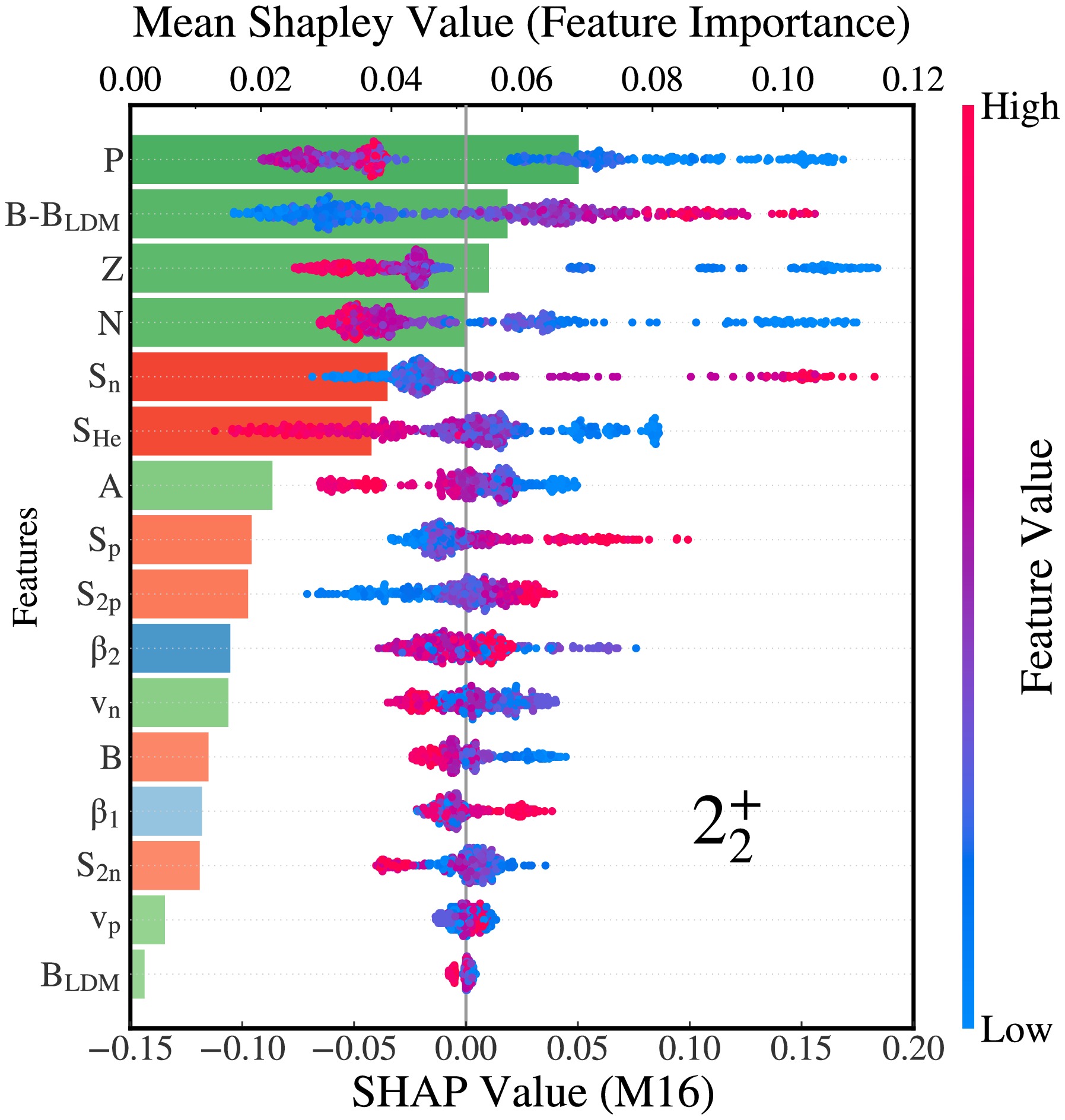 Physically interpretablity. The implementation of machine learning algorithms is often constrained by their "black box" nature, which obscures the reasoning behind their predictions. Recently, explainable AI techniques have gained significant attention as critical tools for addressing this interpretability gap. Among the various methods, SHapley Additive exPlanations (SHAP) has become widely recognized for its effectiveness in providing clear, comprehensible insights into model behavior, while also quantifying feature importance through cooperative game theory frameworks [6568]. In this work, we apply the SHAP technique to gain a deeper understanding of the results obtained using LightGBM. Figure 5 presents a ranking of the features in the $ M16 $ feature space used for predicting $ E(2_2^+) $ using LightGBM. In these plots, the features are ordered along the y-axis according to their impact, with the most impactful feature at the top and the least influential at the bottom. The x-axis represents the relative importance of each feature, as determined by its SHAP value. Features with larger absolute SHAP values have a greater impact on the model’s predictions, while those with smaller values have a smaller effect. The analysis reveals that the feature P is the most critical because it reflects nuclear collectivity, to which $ E(2_2^+) $ has a high sensitivity. A similar behavior of P was also observed during the study of $ E(2_1^+) $ [56, 57]. The difference in binding energy between the experimental data and the predictions of the liquid drop model (denoted as $ B-B_{\rm LDM} $) occupies a secondary position in the ranking, reflecting shell and pairing effects, as well as nuclear deformation [56]. Following this, the top six features also include Z, N, $ S_n $, and $ S_{He} $. Beyond these, all other features have relatively smaller, albeit indispensable, contributions to the prediction of $ E_2^+ $. This suggests that using all 16 basic features appears to be a reasonable tactic for making accurate predictions.