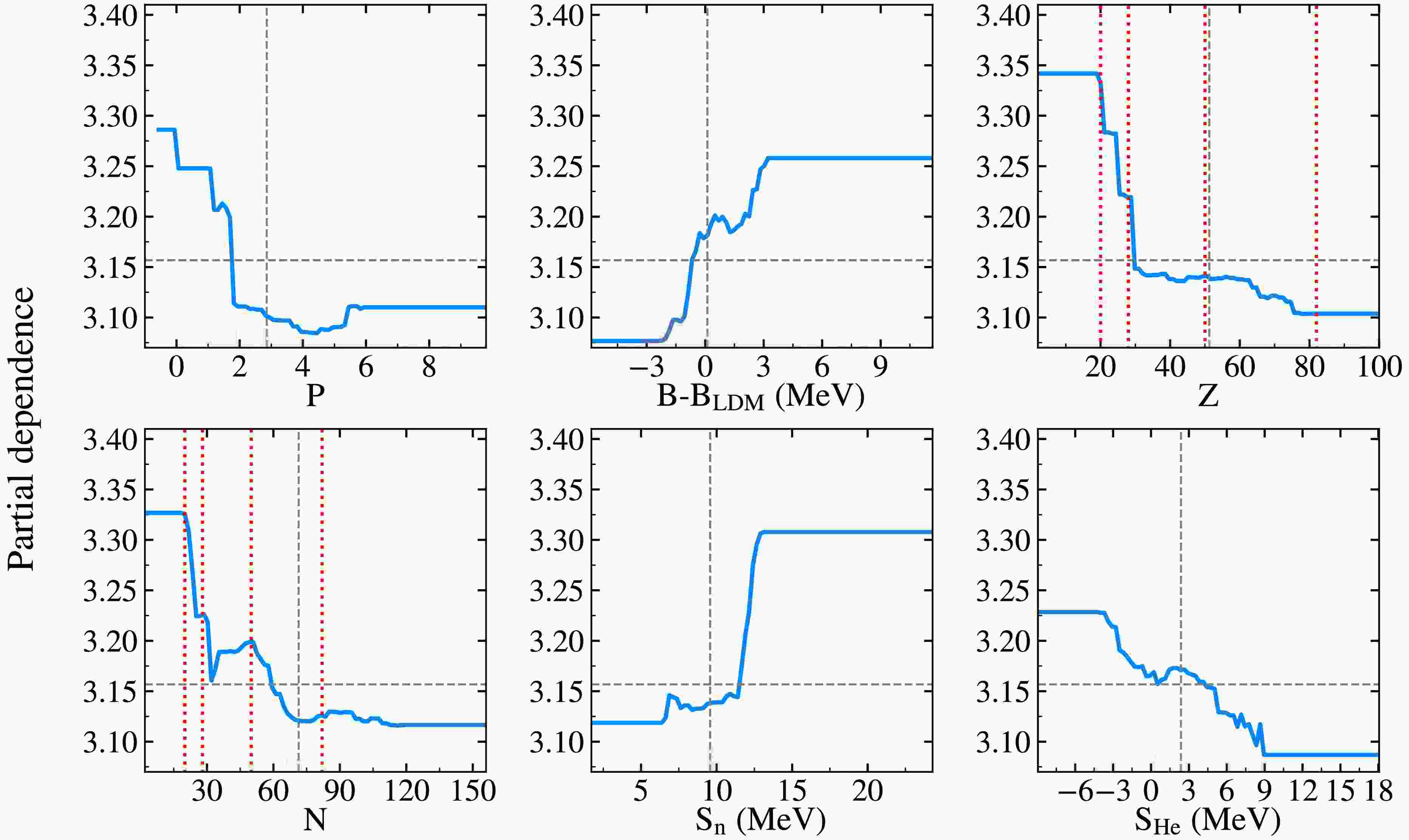 Partial Dependence Plot (PDP) analysis is another effective method for investigating the functional relationship between input features and model predictions in the LightGBM algorithm [69, 70]. Within this framework, if the curve for a particular feature is nearly constant or shows random fluctuations, it suggests that the feature may be insignificant or uninformative. Conversely, a steep PDP curve or one that exhibits significant changes indicates that the feature has a substantial contribution to the model’s predictions. Figure 6 quantifies the impact of the six most salient input features on the prediction of $ E(2_2^+) $. Although PDP and SHAP utilize different techniques to characterize importance, the identified six most important features are the same. Among the input features, proton number (Z) has the most pronounced influence on the prediction of $ E(2_2^+) $. It has a negative impact; an increase in its value from 20 to 80 resulted in a decrease in the PDP value from 3.34 to 3.10, corresponding to a reduction of approximately $ 7.1 $%. The Casten factor P also exhibits a negative impact; an increase in its value from 0 to 4 resulted in a decrease in the PDP value from 3.29 to 3.08, corresponding to a reduction of approximately $ 6.2 $%. Similar behaviors were observed for the features N and $ S_{He} $. However, as shown in Fig. 6, the predicted $ E(2_2^+) $ increases with increasing values of $ B-B_{\rm LDM} $ and $ S_n $. The effect becomes particularly significant when the difference in the binding energy ($ B-B_{\rm LDM} $) increases from –3 to 3 MeV. As shown in Fig. 7, the PDP curve for $ B_{\rm LDM} $ is nearly flat, with a variation of only about 0.16%, indicating a negligible average impact on the model’s output. This finding is consistent with its low importance as revealed by the SHAP analysis.