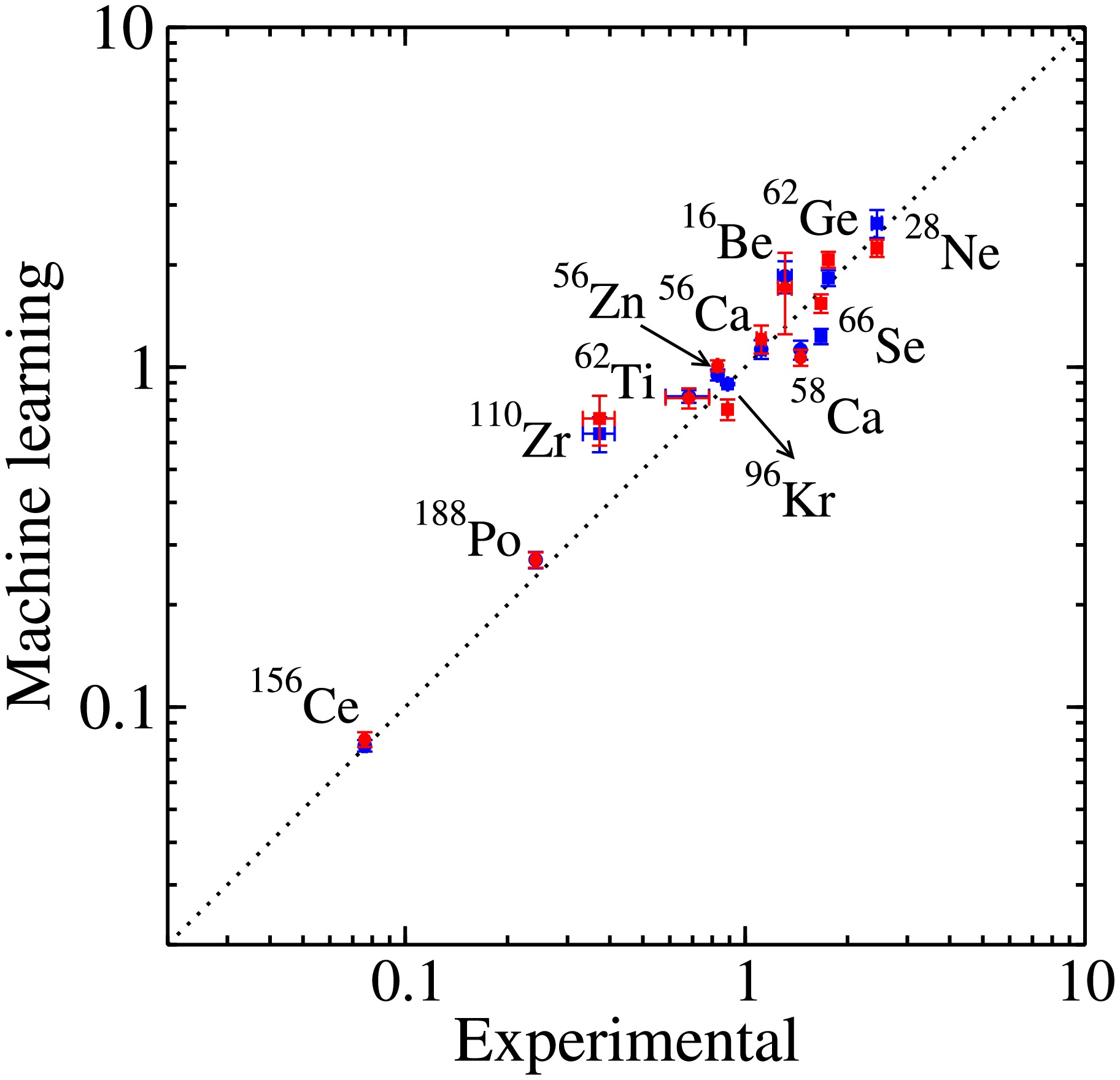where $ {\rm log}_{10}E^{\rm ML} $ represents the ML prediction, $ {\rm log}_{10}E^{\rm Exp} $ denotes the corresponding experimental value, and N is the total number of nuclei.