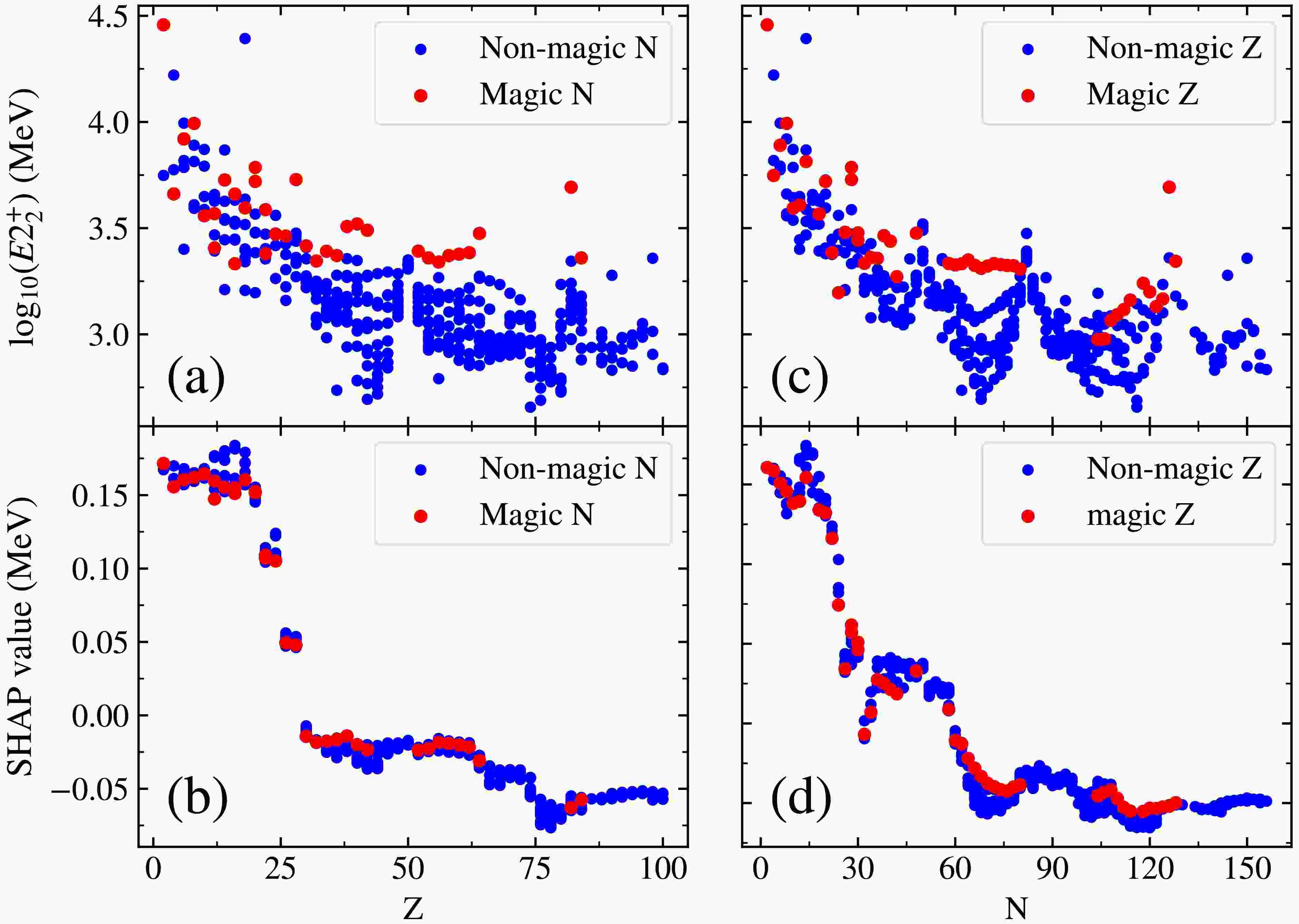 Data-driven approaches should not only aim for predictive accuracy but also strive to uncover underlying physical patterns. In Fig. 6, the PDP curves for Z and N show pronounced slope changes near known magic numbers, indicating the model’s sensitivity to shell effects. Fig. 9(a, c) presents the variation of $ E(2_2^+) $ with Z and N, with red markers denoting cases where Z or N corresponds to a magic number. These results show that closed-shell nuclei generally have higher excitation energies. Fig. 9(b, d) shows how SHAP values vary with Z and N, reproducing the shell effects in many regions, though discrepancies remain in deformation-dominated areas—likely due to the complex nature of nuclear shapes. This indicates that the model's predictive accuracy in such regions is still lower than that in spherical nuclei. Nonetheless, these results demonstrate that the machine learning model captures not only statistical trends but also key physical features of nuclear structure.