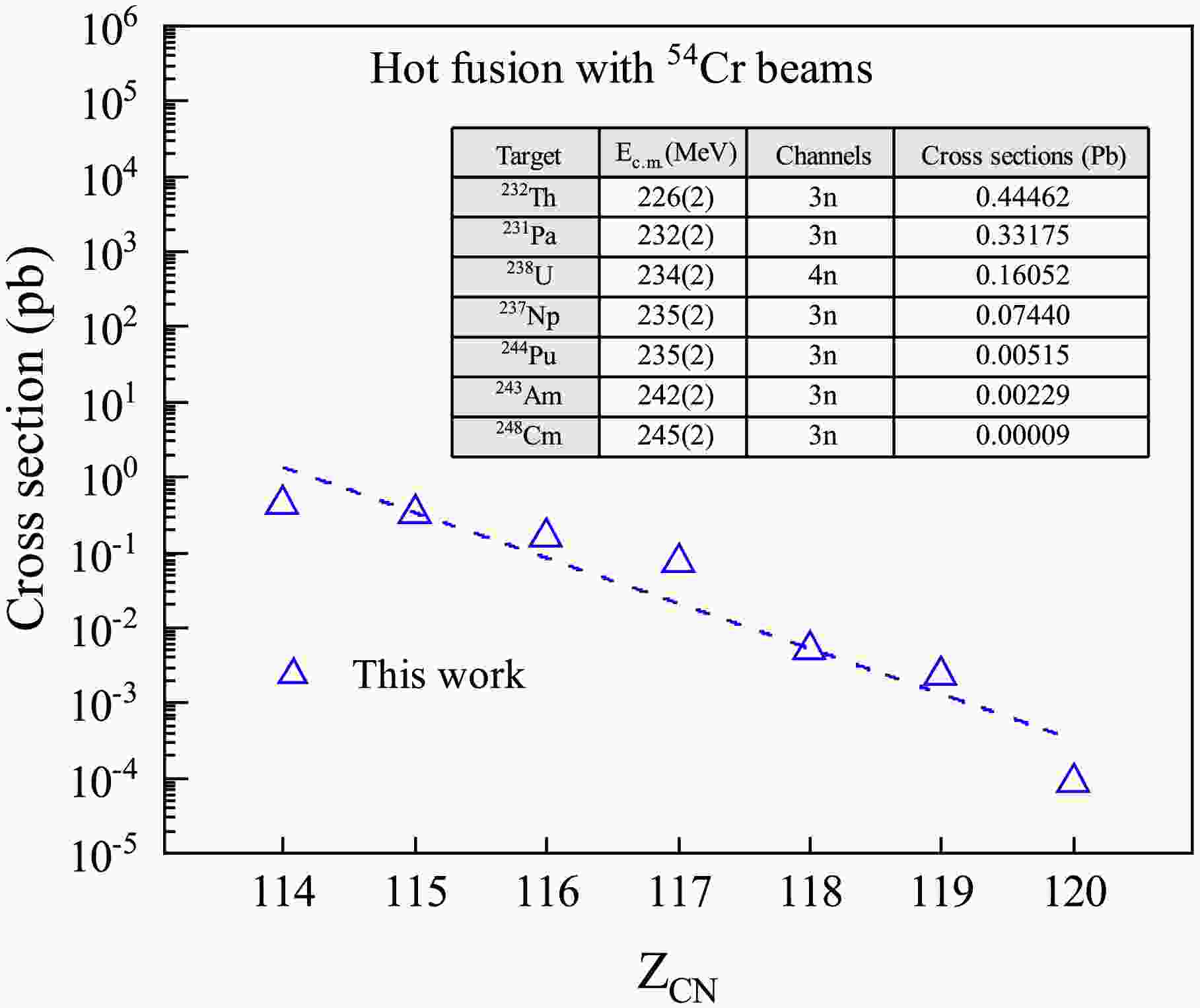 $ Z = 114{-}120 $ from the 3n or 4n exit channels with$ ^{54} $ Cr beams.The production of SHE
