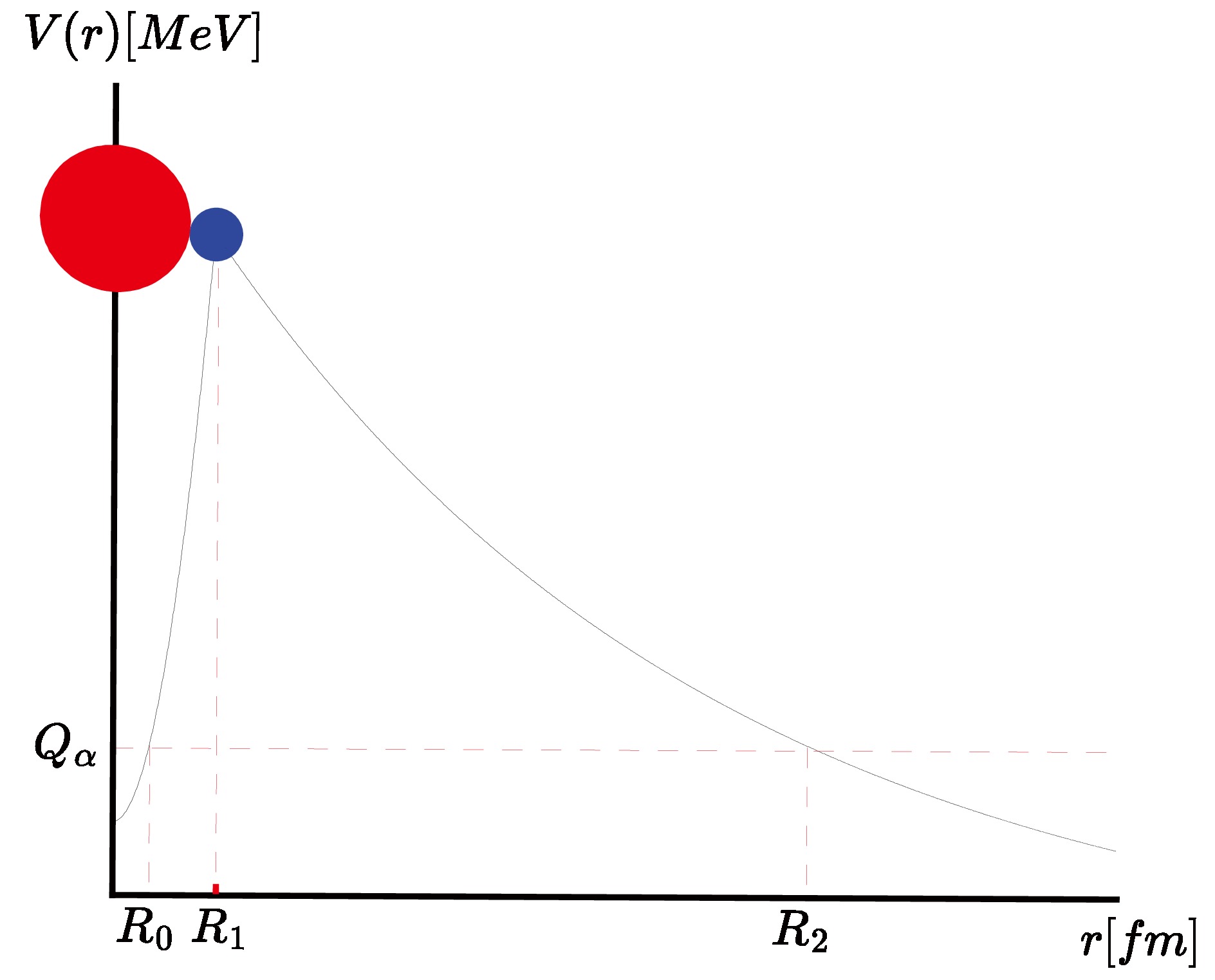 $ P=\exp\left\{-\frac{2}{\hbar}\int_{R_0}^{R_2}\sqrt{2\mu\left[V(r)-Q_{\alpha}\right]}\mathrm{d}r\right\}. $