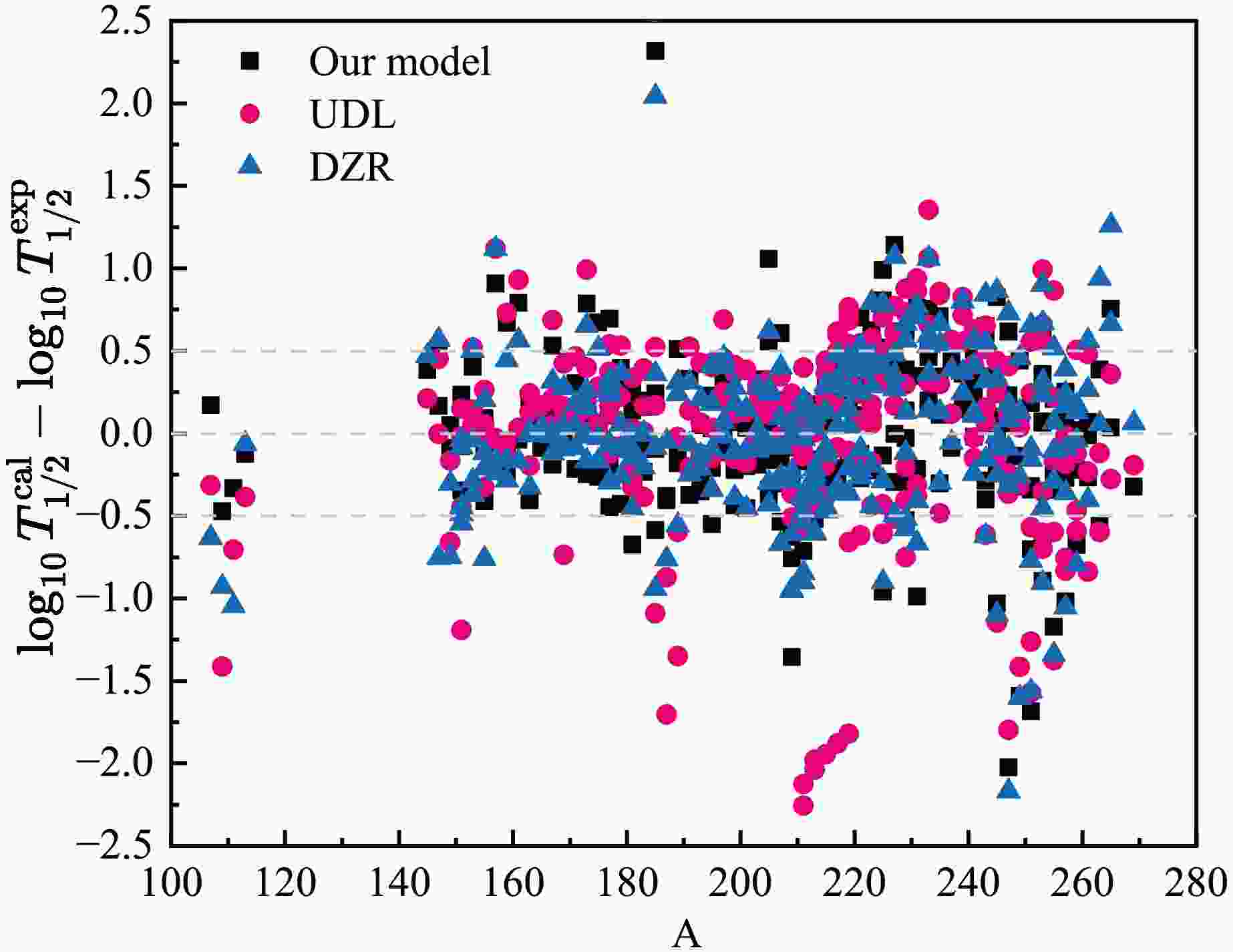 $ \log_{10} T_{1/2}^{{\rm{exp}}} $ and$ \log_{10} T_{1/2}^{{\rm{cal}}} $ are the logarithmic forms of experimental$ \alpha $ decay half-lives and the calculated ones, respectively. n is the number of nuclei involved in different decay cases. The standard deviation$ \sigma $ of the calculated results for the three models and/or formulas is shown in Table 4. From this table, we can clearly see that the standard deviation$ \sigma $ of our model only is 0.408 for all 559 nuclei, 0.323 for 177 even-even nuclei, 0.459 for 277 odd-A nuclei, and 0.391 for 105 odd-odd nuclei. These values are smaller than those of the UDL and DZR results, which proves that our model achieves satisfactory results.Formulas Total e-e e-o o-o Our model 0.408 0.323 0.459 0.391 UDL 0.589 0.349 0.633 0.632 DZR 0.436 0.337 0.493 0.423 Table 4. Standard deviations