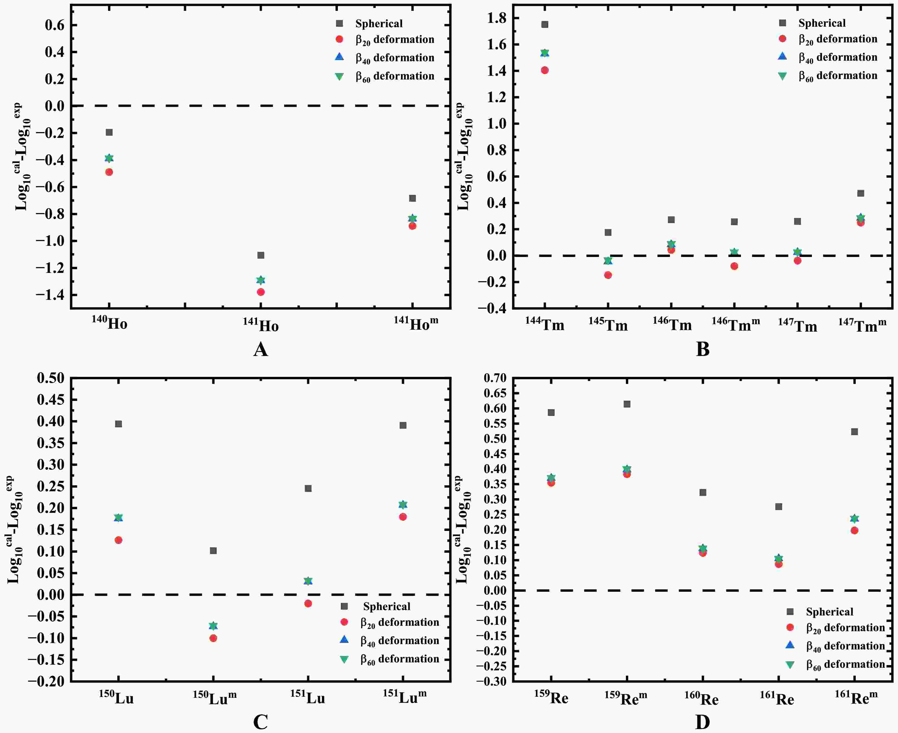 To further assess how nuclear deformation affects proton radioactivity half-lives, we computed individual half-lives considering quadrupole, hexadecapole, and hexacontatetrapole deformations. These results were then compared to those from the GLM, as shown in Figure 6. Our analysis indicates that the calculated half-life decreases with the inclusion of deformation effects, with the most significant reduction observed when only quadrupole deformation is considered. For rhenium (Re), the calculated half-life under quadrupole deformation shows the most significant deviation among all. A similar trend is observed for holmium (Ho), lutetium (Lu), and thallium (Tl). These findings confirm that quadrupole deformation plays a pivotal role in reducing proton radioactivity half-lives. This insight deepening our understanding of the nuclear structure of these exotic nuclei.