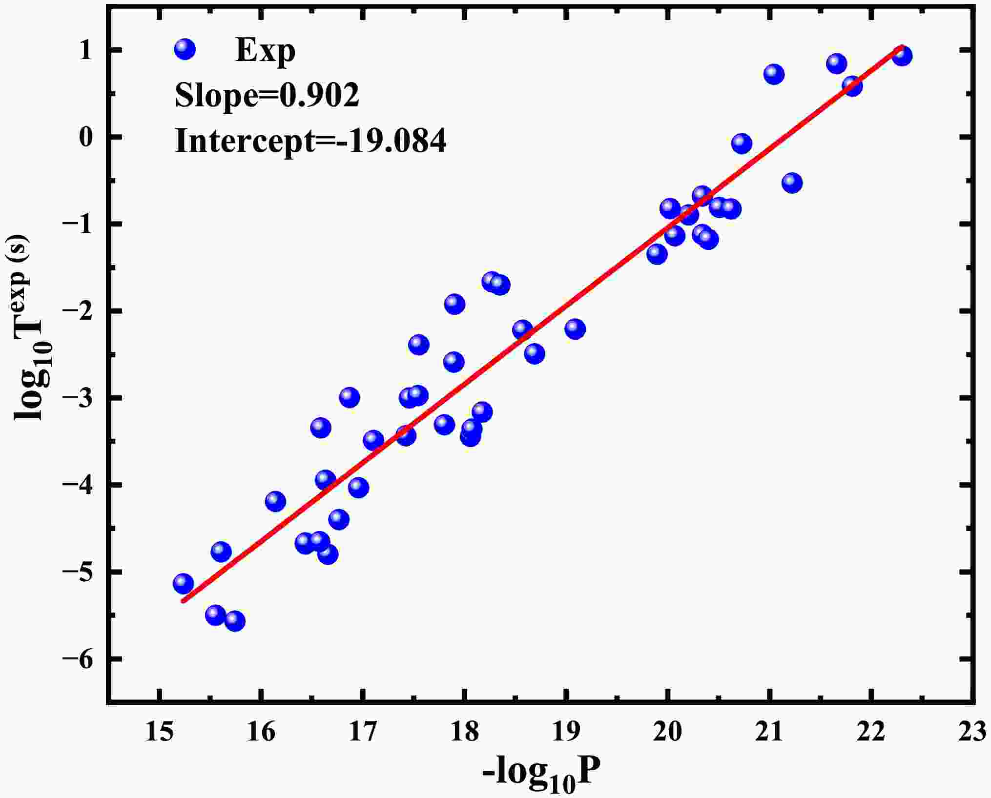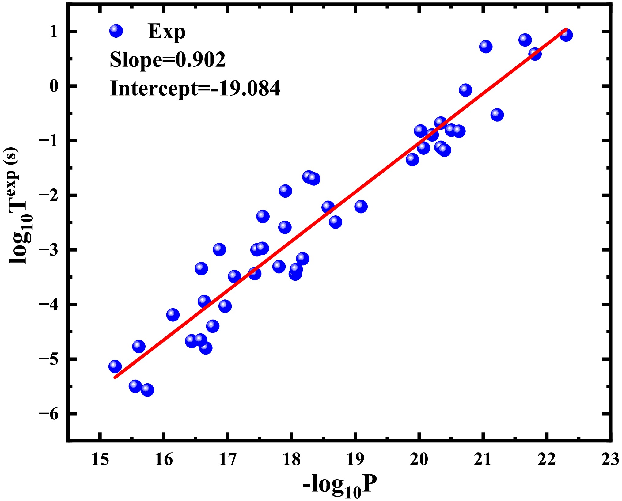 $\alpha$ decay and cluster radioactivity, defined by the negative logarithm of the penetration probability plotted against the logarithm of the experimental half-life. In 2023, Zhang et al. extended this relationship to proton radioactivity, demonstrating its usefulness in evaluating theoretical methods [80]. To better assess the agreement between our model and experimental data, we construct a comparable curve comparing the theoretically predicted half-lives with measured values. Figure 7 illustrates this correlation between$-\log_{10}P$ and$\log_{10}T^{\rm exp}$ . Here, the horizontal axis represents the negative logarithm of the penetration probability calculated for proton radioactivity half-lives using DGLM, while the vertical axis shows the logarithm of the experimental half-life. The strong linear relationship observed between$-\log_{10}P$ and$\log_{10}T^{\rm exp}$ confirms the internal consistency of our computational results.