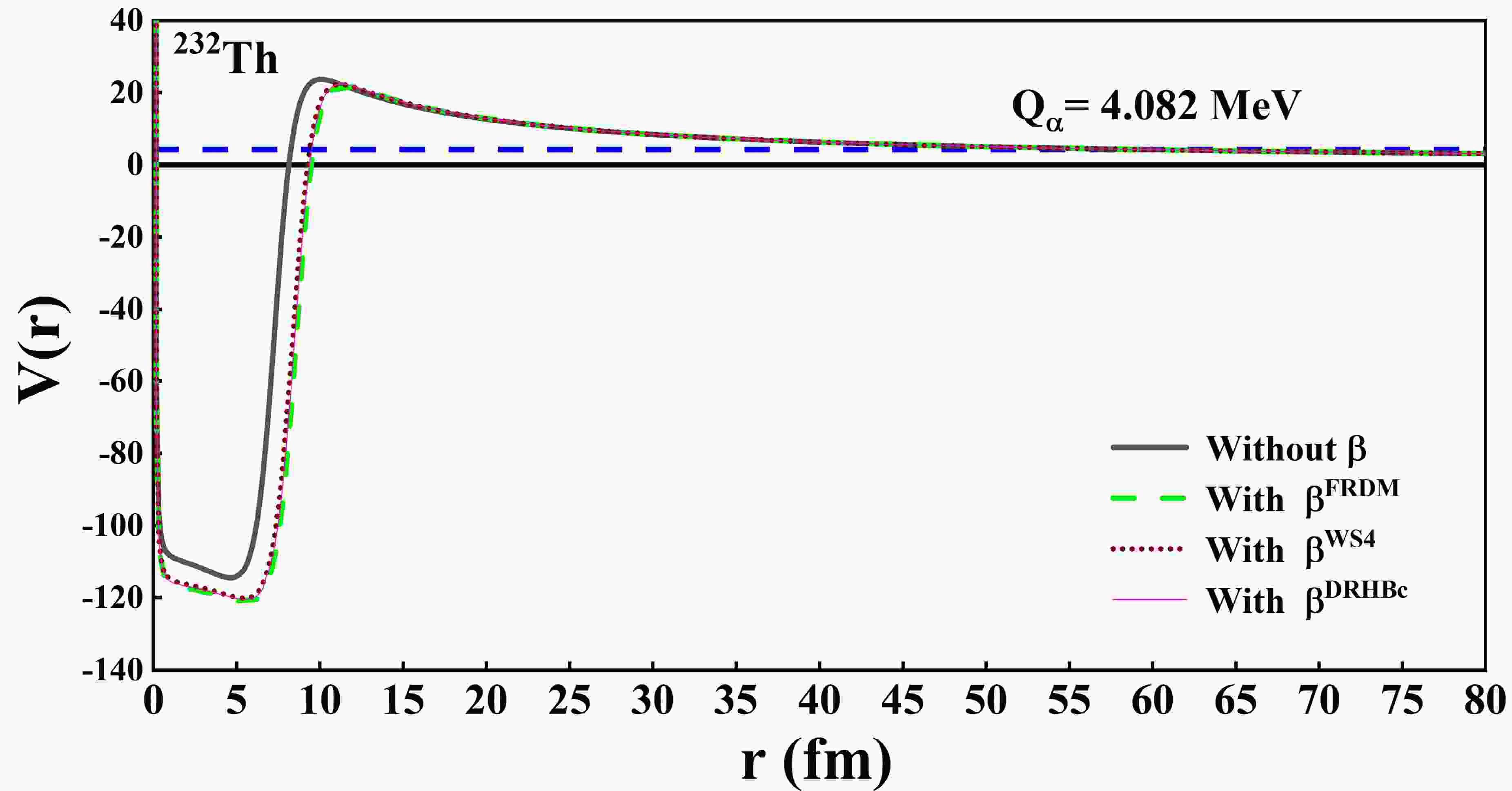 $ V(r) $ for the nucleus 232Th in TPA with and without deformation. The black dashed line represents the potential without deformation, whereas the other three curves correspond to the potential changes with deformation from the FRDM (green dashed line), WS4 (brown dashed line), and DRHB (red dashed line) models.Additionally, some studies have shown that the average diffuseness parameter