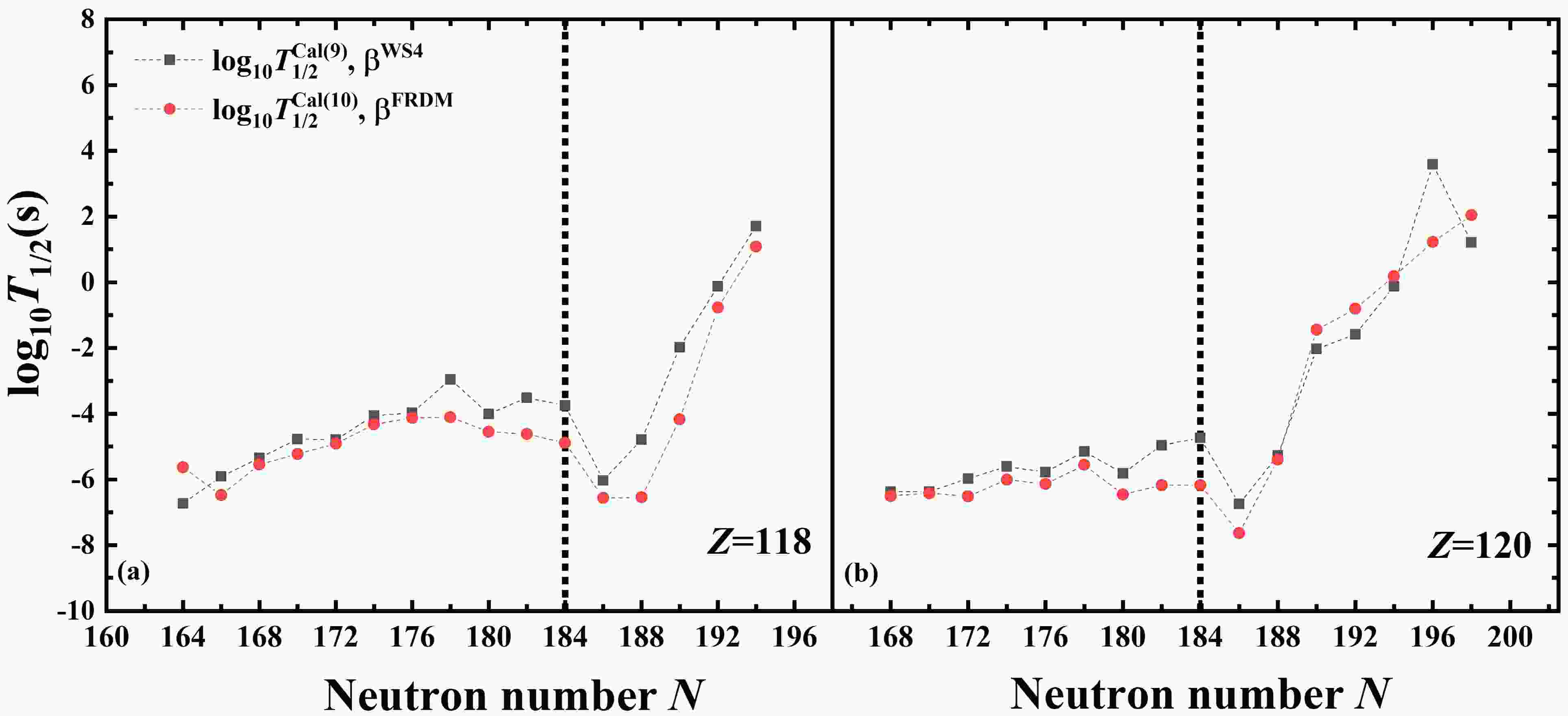 $ a_0 $ . The$ Q_{\alpha} $ and nuclear deformations$ \beta_2 $ ,$ \beta_4 $ , and$ \beta_6 $ are taken from the WS4 [49] and FRDM [55] models, respectively. The corresponding results of logarithms of α-decay half-lives are denoted by$ \log_{10}T_{1/2}^{\rm{Cal(9)}} $ and$ \log_{10}T_{1/2}^{\rm{Cal(10)}} $ , respectively. The black dashed lines denote the neutron number N = 184. -