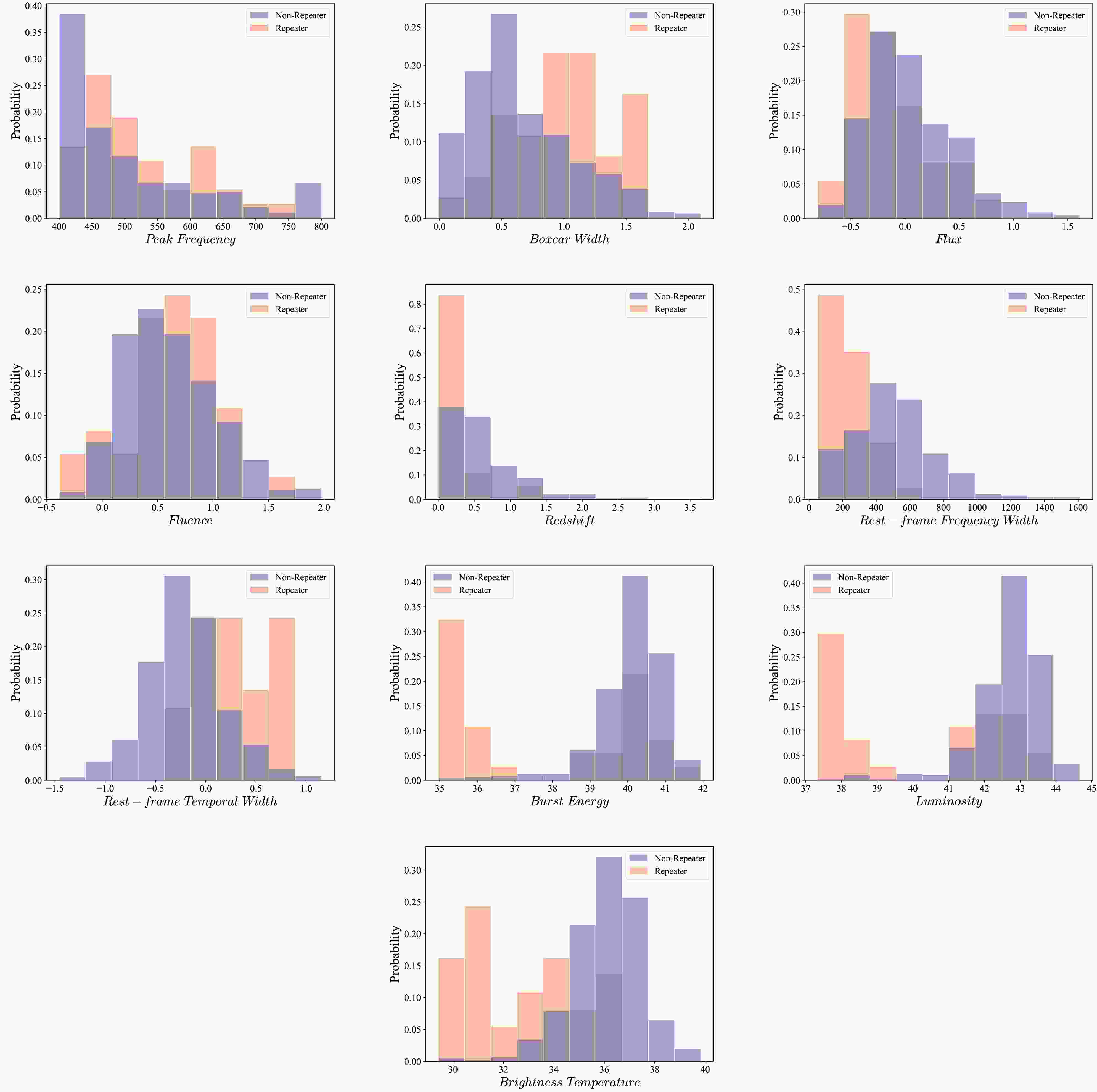 In our unsupervised machine learning framework, ten features are extracted either directly from the observed properties reported in the CHIME/FRB catalog or derived through standard calculations. These features include peak frequency, flux density, fluence, boxcar width, redshift, rest-frame frequency width, rest-frame temporal width, burst energy, luminosity, and brightness temperature. The distributions of these features are shown in Fig. 1. Detailed definitions and descriptions of each feature are provided below.