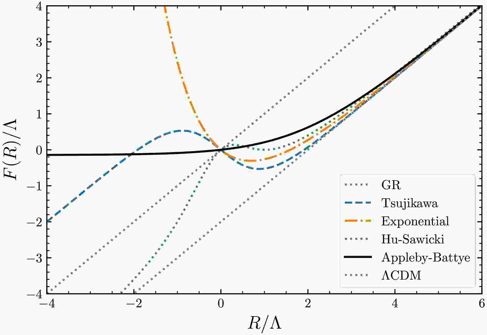 $ F(R) $ function. Some well-studied viable models satisfying the above requirements are (with different notations to the original papers)● Hu-Sawicki model [19]