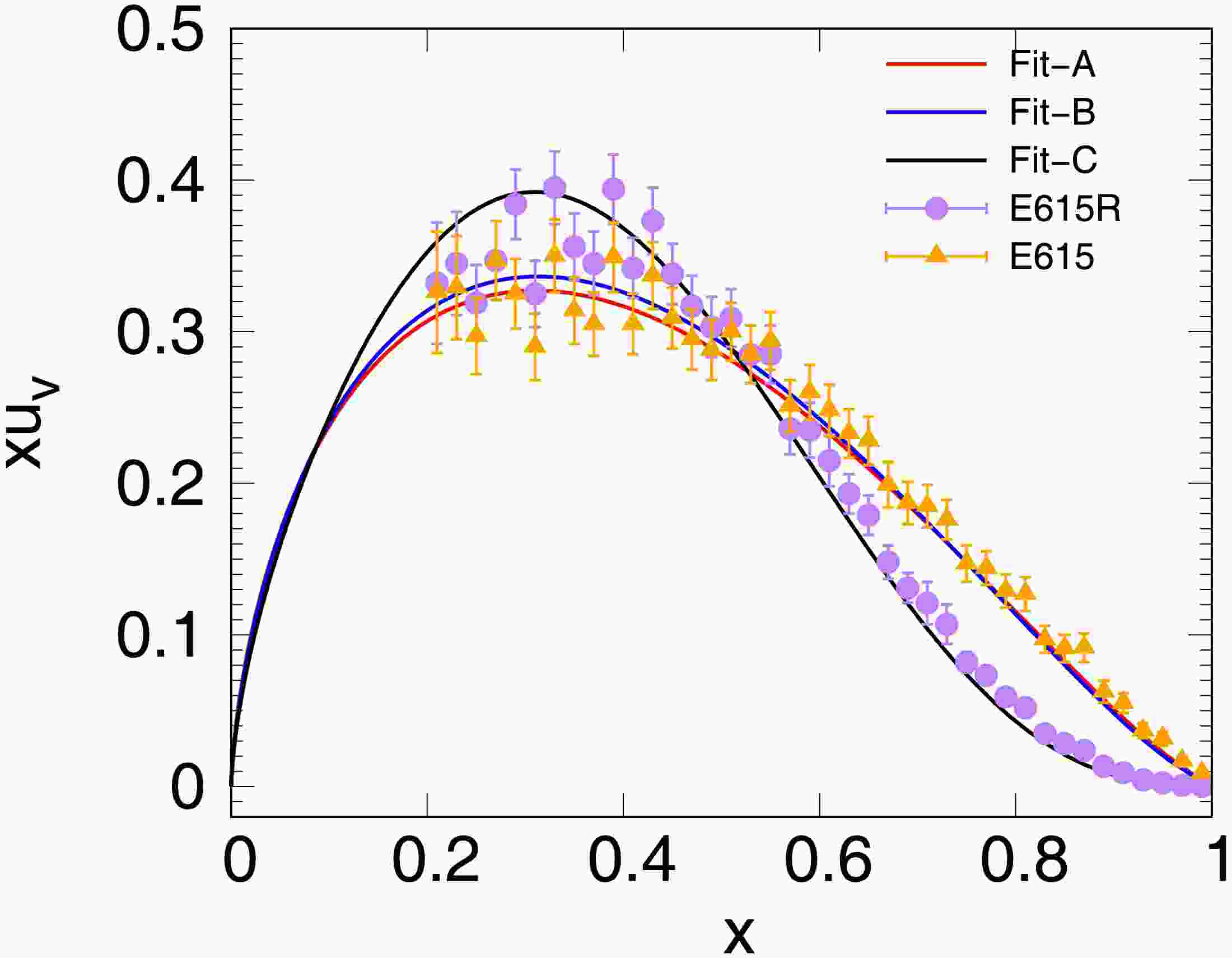 $ Q^2=20\; {\rm{GeV}}^2 $ , obtained by performing the modified DGLAP evolution with the initial distribution in Eq. (5). In Fig. 3, the red line shows that the valence quark distribution function from Fit-A exhibits a good agreement with the E615 data [55]. It should be noted that the E615 data were reanalyzed in Ref. [56], resulting in a significantly softer valence distribution at large-x. Utilizing this modified dataset (E615R), we conducted a fitting using Eq. (5). However, we found that the fitting was inadequate. This may be attributed to the simplicity of the functional form, which requires an additional factor to suppress the valence quark distribution. Consequently, we refitted the experimental data by employing the same valence quark distribution form as that utilized in Ref. [56].$ u_{\nu}(x, Q_{0}^{2})=\bar{d}_{\nu}(x, Q_{0}^{2})=A_{\pi}x^{B_{\pi}}\left(1-x\right)^{C_{\pi}}(1+Dx^2). $