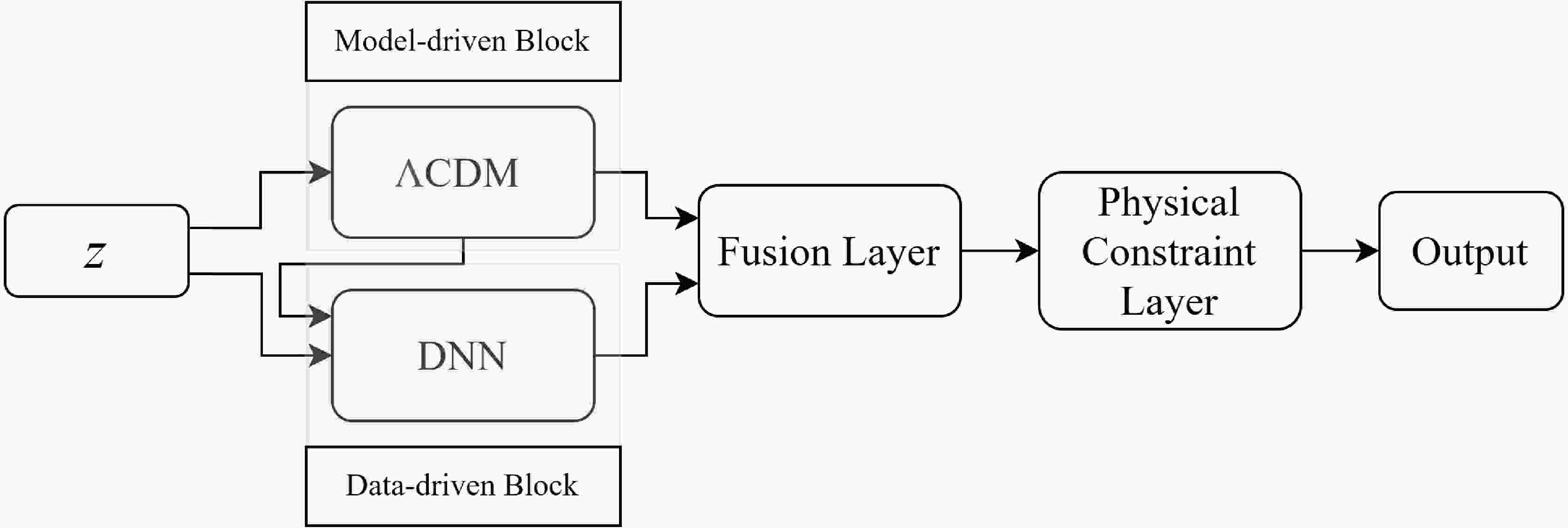 $ \Lambda $ CDM prediction using a single free parameter—the matter density$ \Omega_{\rm m} $ —to generate theoretical outputs$ {\boldsymbol{y}}_{\rm{model}}({\boldsymbol{z}}) $ . This block operates directly on redshift inputs and is trained jointly with the rest of the network. The data-driven block is a four-layer fully connected DNN, which receives both the redshift and model prediction as inputs. It is mathematically described by: