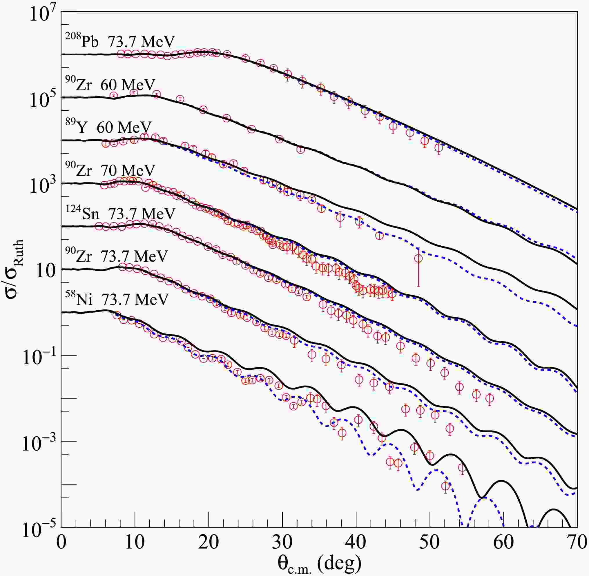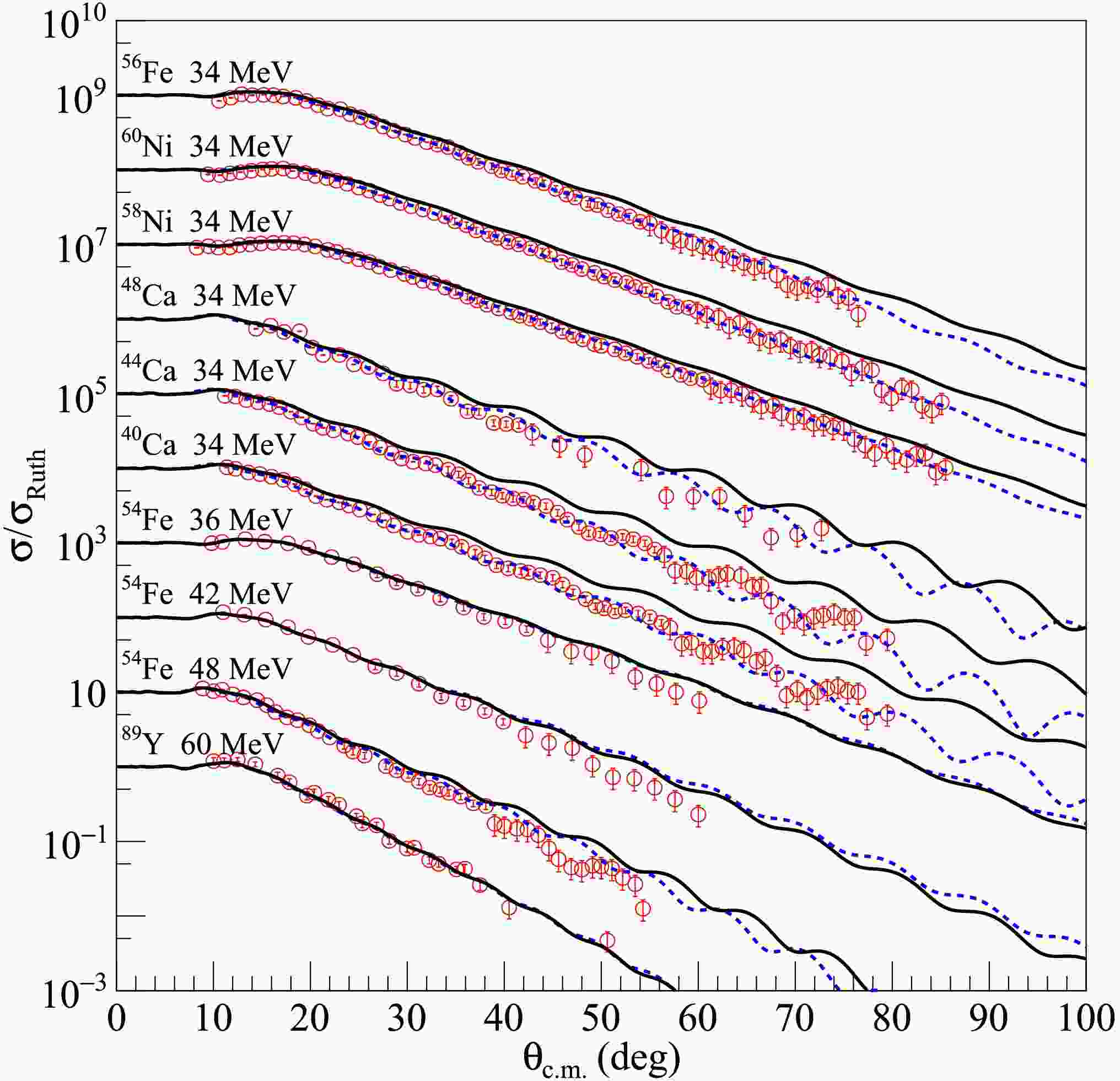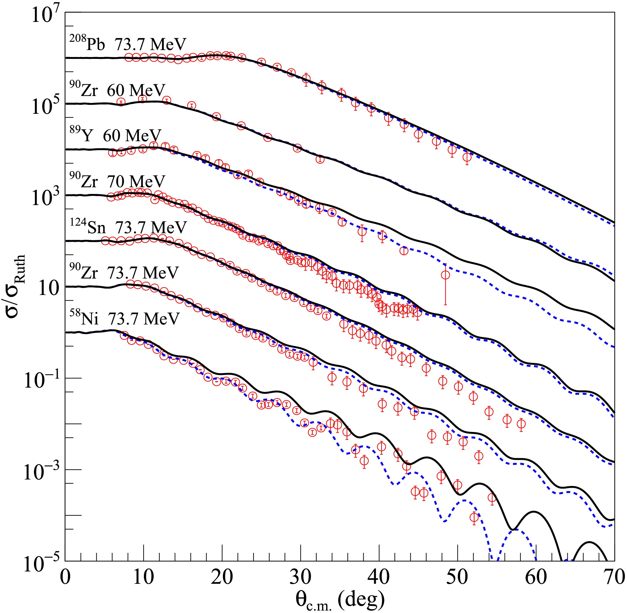 Figure 1.  (color online) Comparisons between optical model calculations and experimental data for 6Li elastic scattering from medium mass and heavy targets at incident energies indicated in the figure. The blue dashed and black solid curves represent results calculated with optimal and average values of rms proton radii, respectively. The data sets are offset for optimum view. The experimental data are from Refs. [3655].