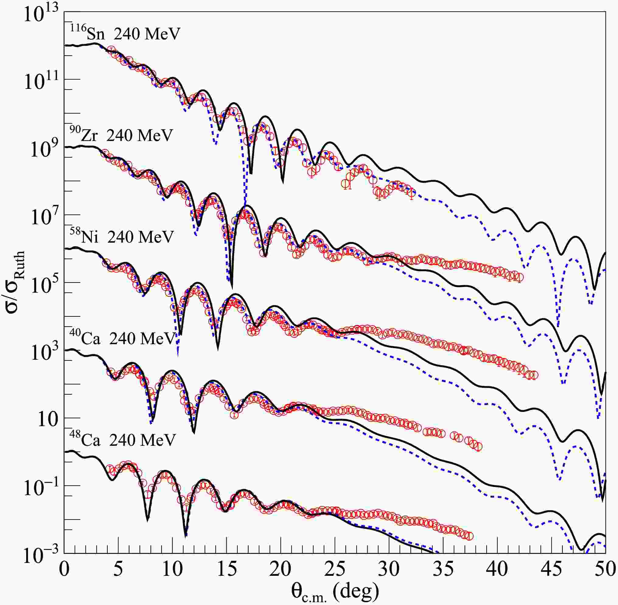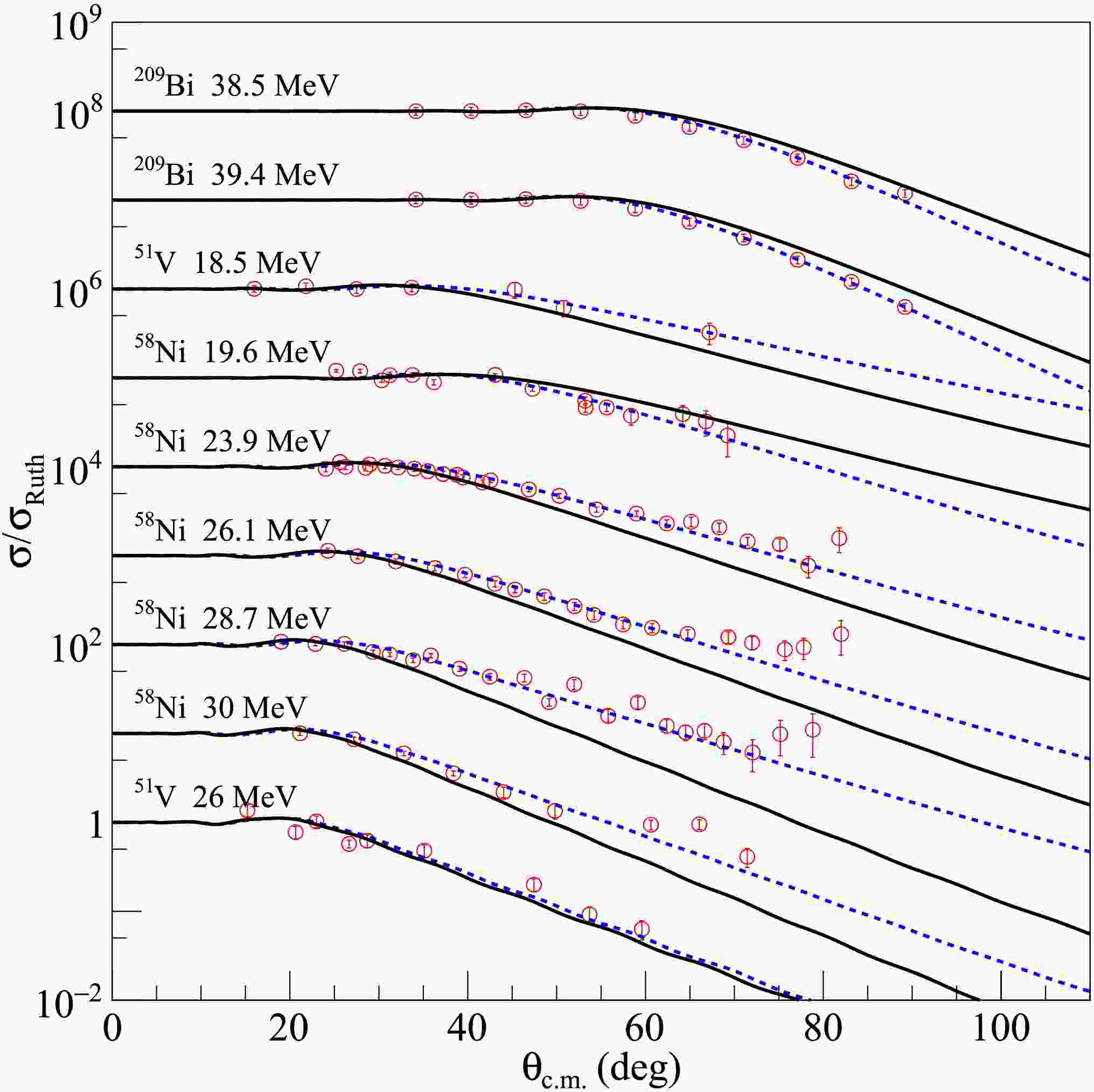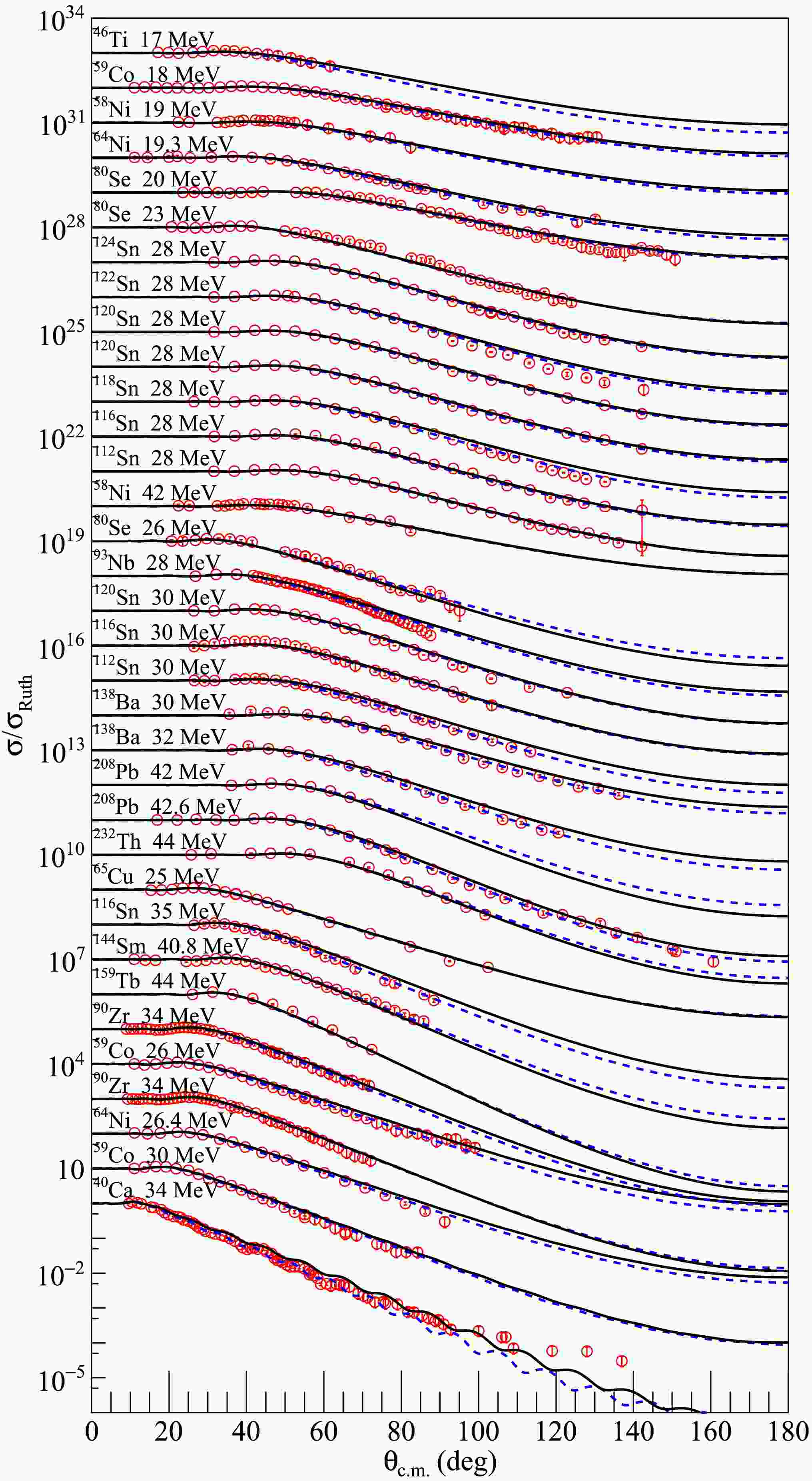 Figure 1.  (color online) Comparisons between optical model calculations and experimental data for 6Li elastic scattering from medium mass and heavy targets at incident energies indicated in the figure. The blue dashed and black solid curves represent results calculated with optimal and average values of rms proton radii, respectively. The data sets are offset for optimum view. The experimental data are from Refs. [3655].
