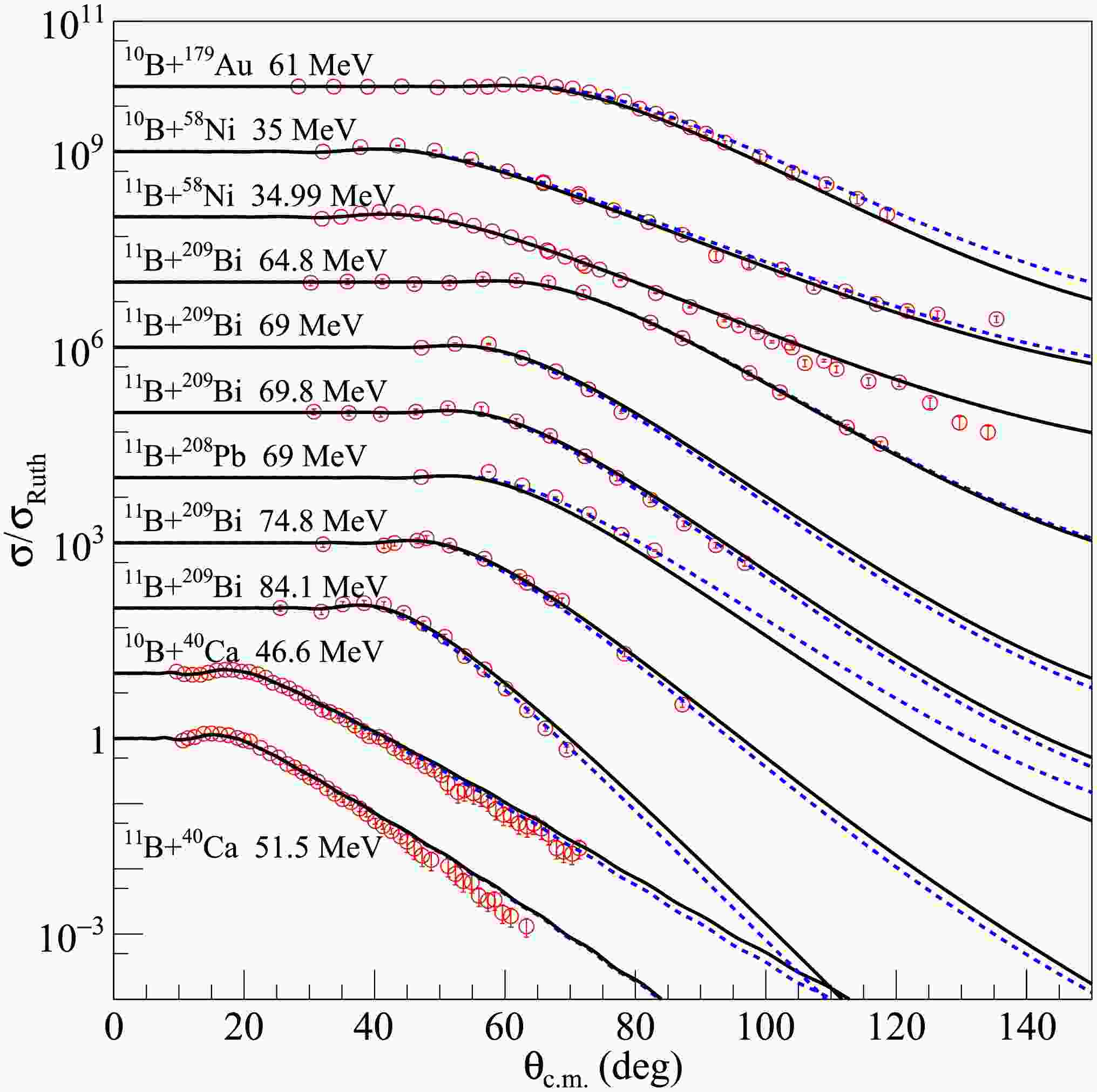 Figure 7.  (color online) Same as Fig. 1, but for 10B and 11B projectiles. The experimental data are from Refs. [8085].
