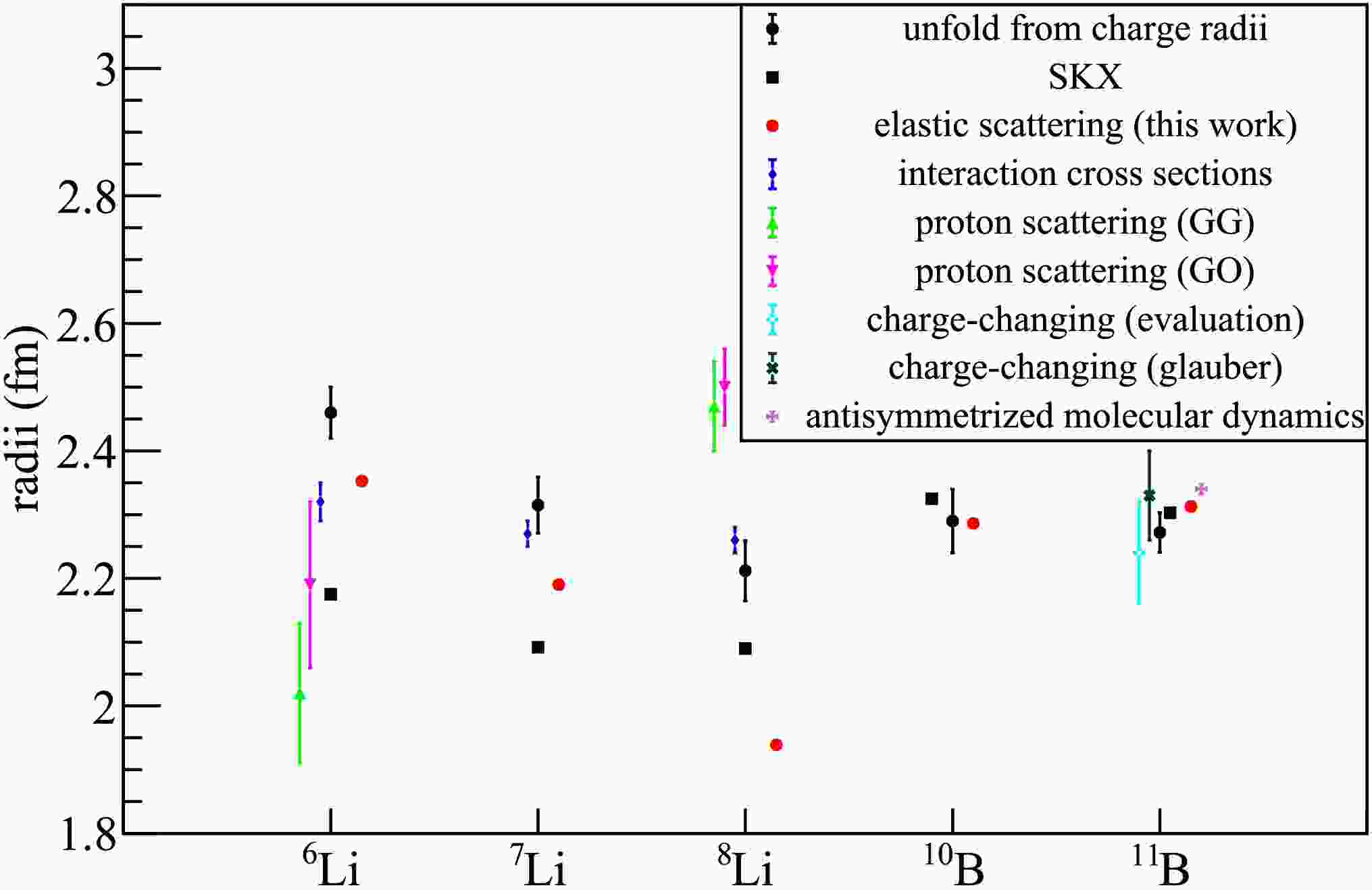 Table 1.  Experimental data analyzed in the present work for 6,7,8Li, and 10,11B from different targets, their references, and corresponding $ \chi^{2} $ values calculated with the extracted rms proton radii.