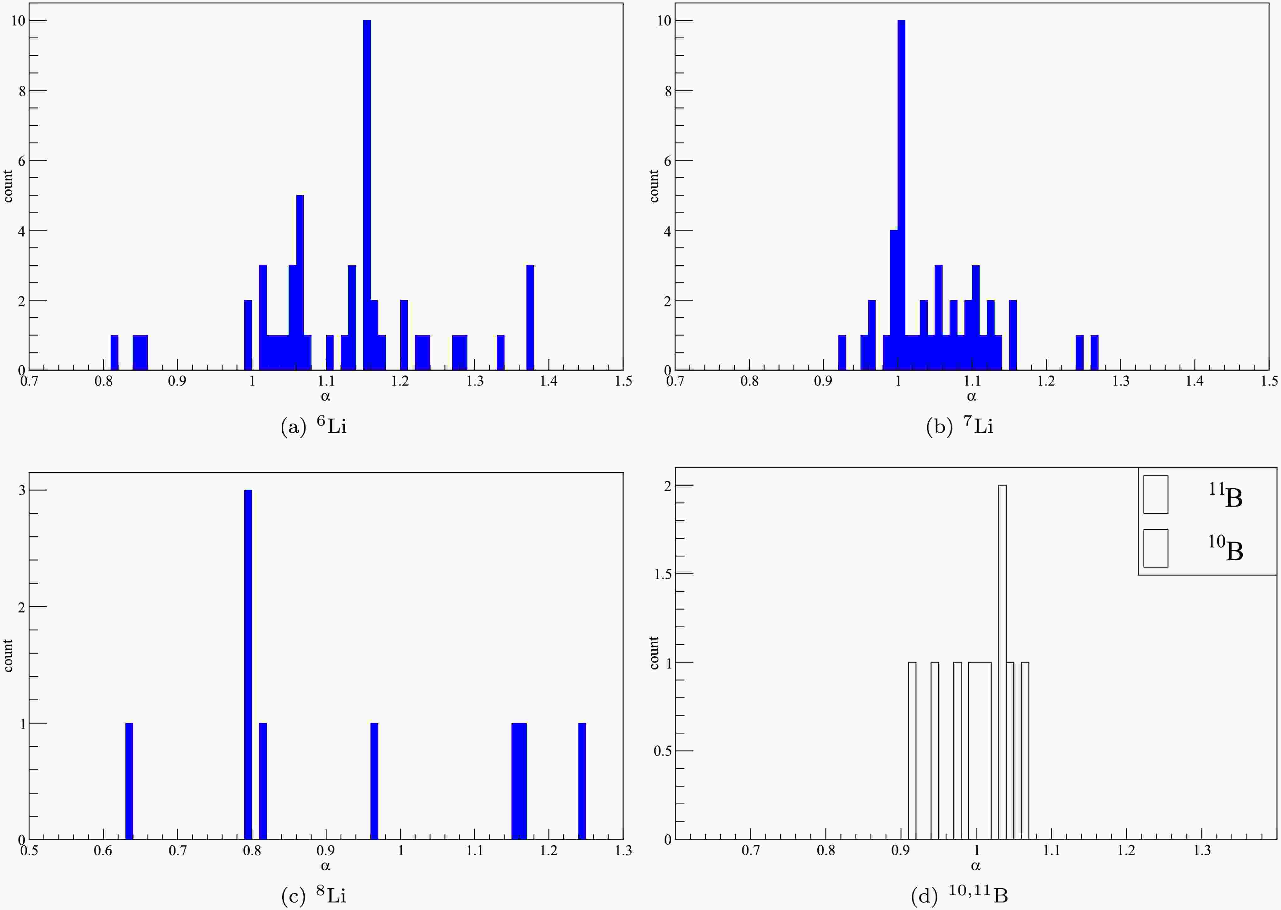 Notably, the optimal rescaling factors for 6Li and 7Li predominantly cluster in the range of $ \alpha > 1.00 $. In contrast, the rescaling factors for 8Li exhibit significant dispersion, and due to the limited number of data points, definitive conclusions remain a elusive challenge similarly encountered with 10B and 11B. The average values of these distributions are adopted as the final rescaling factors for each projectile, demonstrating close correspondence to the central values of Gaussian functions fitted to the distributions. The final rescaling factors provide recommended rms proton radii for 6Li, 7Li, 8Li, 10B and 11B, are 2.35, 2.19, 1.94, 2.29, and 2.31 fm.