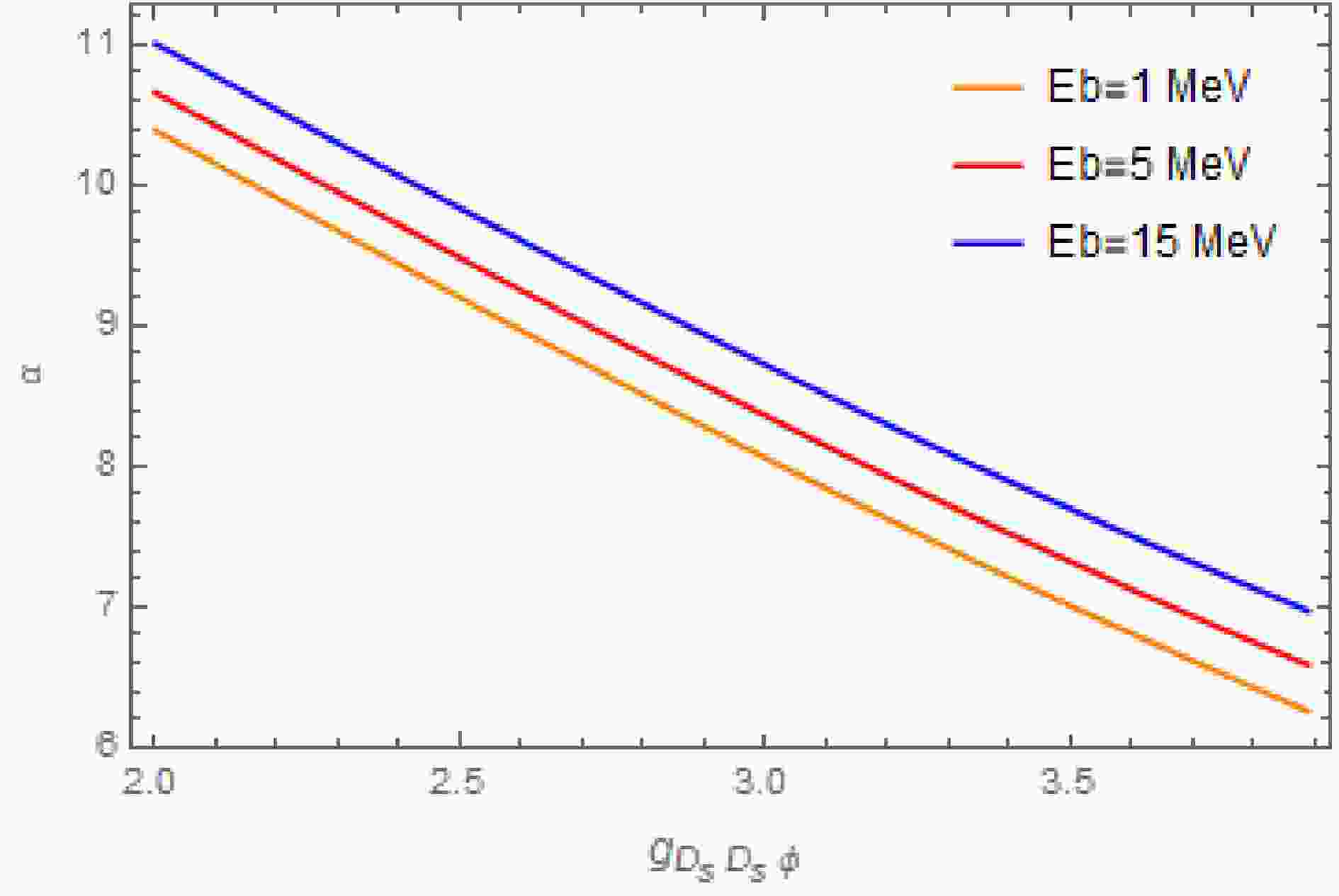 $ g_{D_sD_s\phi} $ , the parameter α, and the binding energy$ E_b $ of the$ D_s\bar{D}_s $ system (defined as$ E_b=m_{D_s}+m_{\bar{D}_s}-E $ and varying from 0 to 15 MeV), we obtain all eigenvalues of this equation. The set of values of$ g_{D_sD_s\phi} $ , α, and$ E_b $ that yields the eigenvalue closest to 1.0 is selected. We find that for a very small coupling constant$ g_{D_sD_s\phi} $ , a very large parameter α is required for a bound state to exist. Therefore, we choose$ g_{D_sD_s\phi} $ in the interval of (2–3.89) for our analysis. The values of$ g_{D_sD_s\phi} $ and α for possible bound states with binding energies$ E_b=1 $ MeV,$ E_b=5 $ MeV, and$ E_b=15 $ MeV are presented in Fig. 1. From Fig. 1, we observe that for a given coupling constant$ g_{D_sD_s\phi} $ , a larger binding energy requires a larger value of the parameter α. Additionally, our study reveals that the$ D_s\bar{D}_s $ system cannot form a bound state if only the contribution of ϕ or$ J/\psi $ exchange is considered.Based on the obtained numerical results for the
