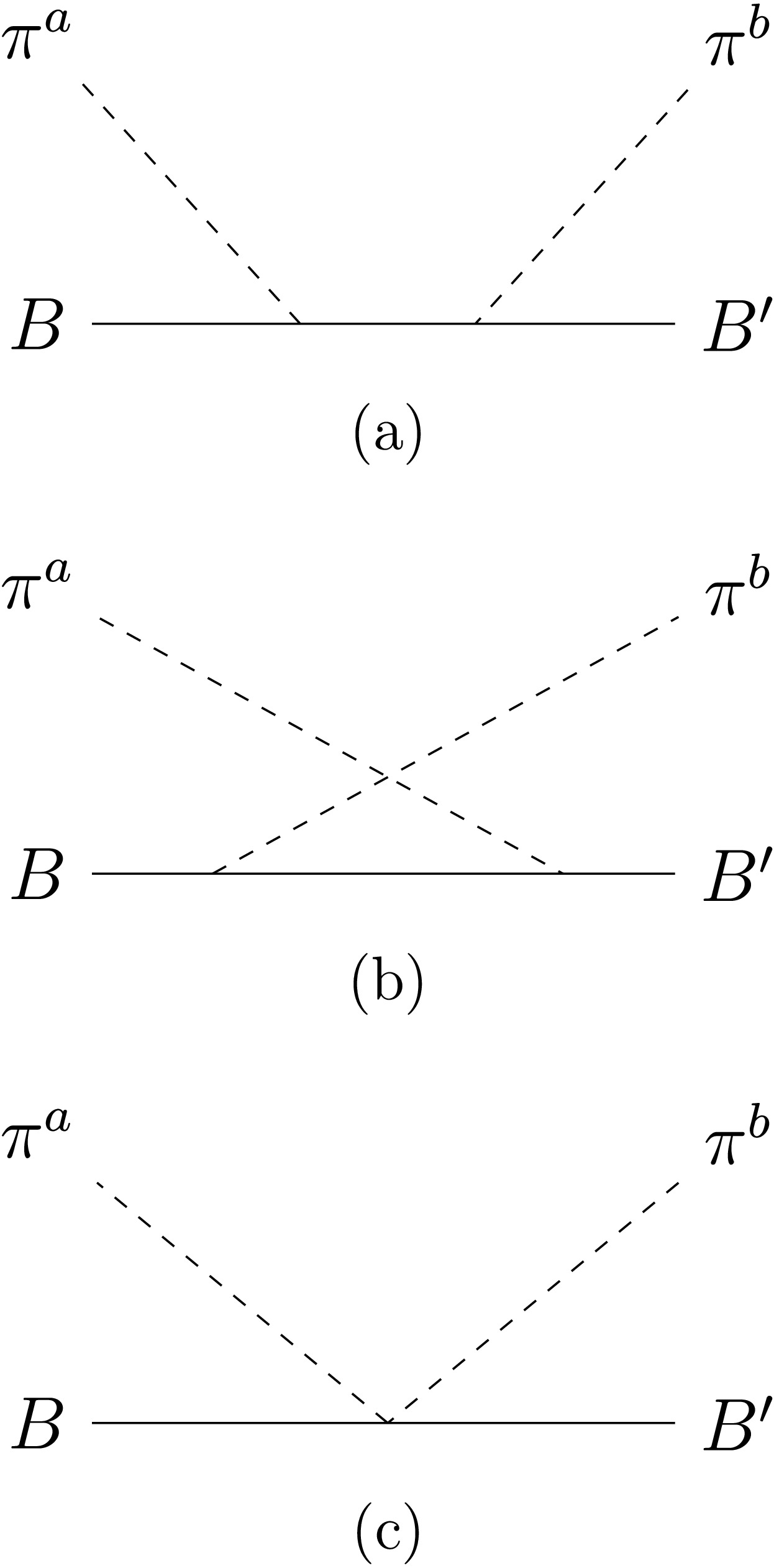 $ N_c $ limit by the diagrams displayed in Fig. 1. In Eq. (1),$ \pi $ represents one of the nine pseudo scalar mesons$ \pi $ , K,$ \eta $ , and$ \eta^\prime $ of momenta$ k=(k^0,k^1,k^2,k^3) $ and$ k^\prime=({k^\prime}^0,{k^\prime}^1,{k^\prime}^2,{k^\prime}^3) $ and flavors a and b for the incoming and outgoing mesons, respectively. B and$ B^\prime $ represent the incoming and outgoing baryons of momenta p and$ p^\prime $ , respectively. Soft mesons with energies of order unity are considered in the process. The goal is to explicitly evaluate the corresponding scattering amplitude at leading and subleading orders, incorporating the effects of the baryon mass splitting$ \Delta $ defined in the previous section. Before tackling the problem, it is convenient to introduce some key concepts on large-$ N_c $ QCD to set notation and conventions. Further details on the formalism can be found in Refs. [6, 7].In the large-