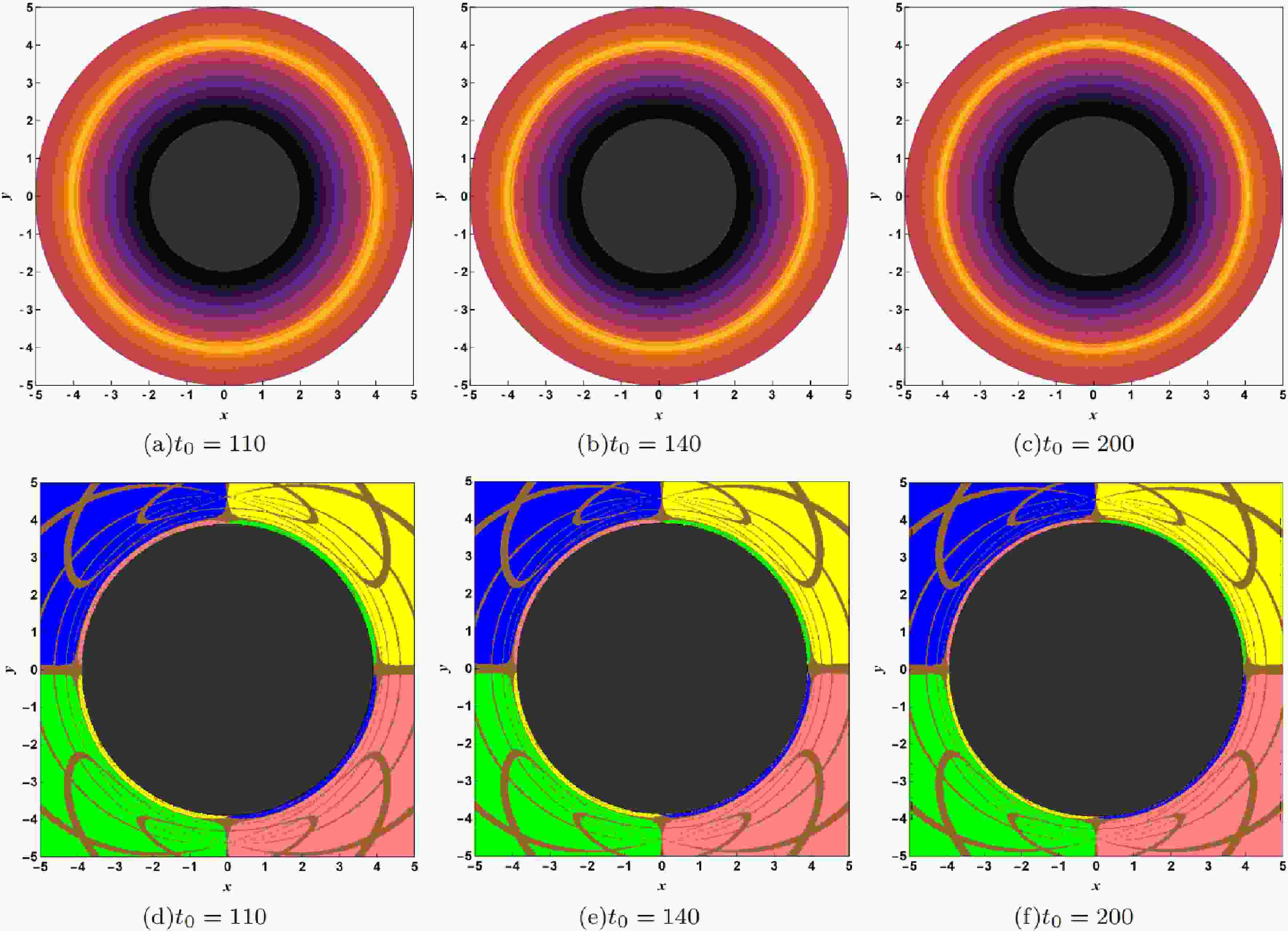 $ t_{o}=110,140 $ , and 200 with$ r_{o}=50 $ . The upper row shows the images of black hole with an accretion disk. The bottom row illustrates the black hole shadow images without an accretion disk. The gray inner regions represent the black hole shadows.