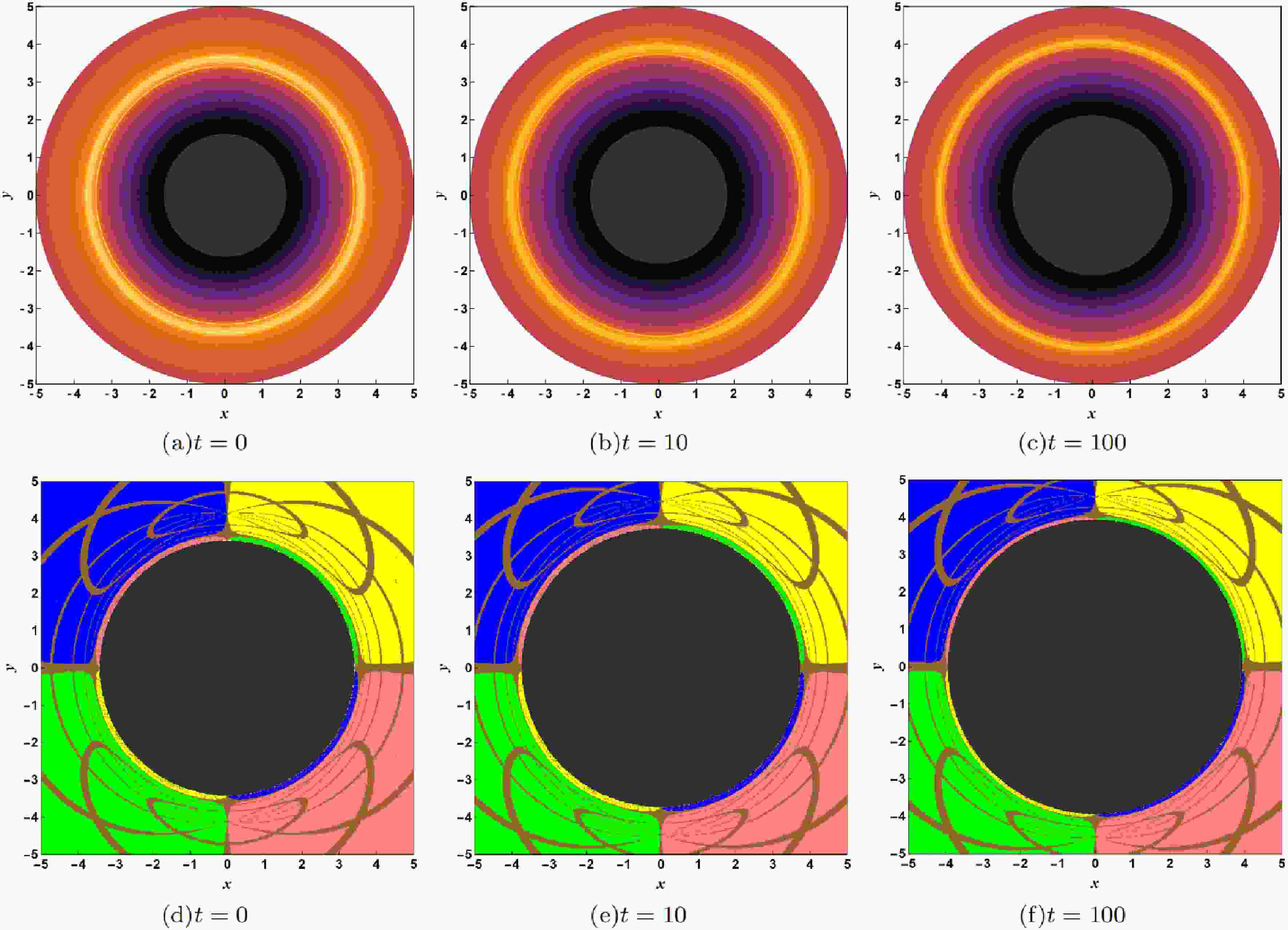 Figure 12. (color online) The black hole images with and without an accretion disk when t = 0, 10, and 100. The upper row shows the images of the black hole with an accretion disk. The bottom row illustrates the black hole shadow images without an accretion disk.