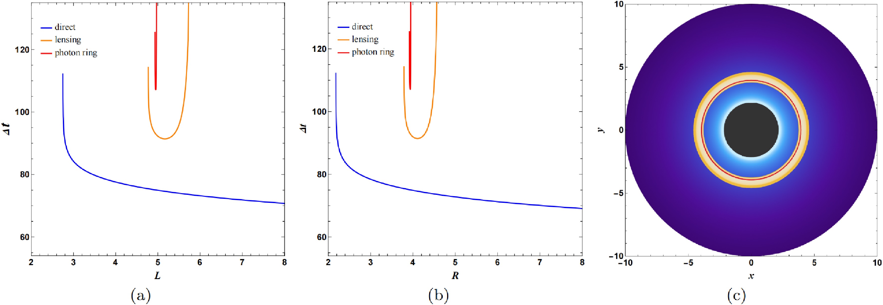 $ \Delta t=t_{o}-t_{e} $ of lights propagating from accretion disk to observer. Here, the observer time$ t_{o}=170 $ , and the radius coordinate of the observer$ r_{o}=50 $ . Figure 14 (a) and (b) exhibit the variation of time delay$ \Delta t $ with angular momentum L and the radius R on the observer's screen, respectively. Blue, orange and red lines represent the time delay$ \Delta t $ of lights from direct emission, lensing ring and photon ring, respectively. On average, the time delay$ \Delta t $ of light rays from the photon ring is the largest, followed by that from the lensing ring, and the smallest is that from the direct emission. The time delay$ \Delta t $ in the direct emission decreases with the increase of L and R. The time delay$ \Delta t $ in the lensing ring and photon ring first decreases and then increases as L or R increases. It is because the light rays with small L originate from the accretion disk close to the horizon and are subject to stronger gravity. The light rays with large L originate from the exterior of the accretion disk and require more time to traverse longer trajectories. Figure 14 (c) exhibits the density plot of the time delay$ \Delta t $ of lights in black hole image, in which the gray inner region represents the black hole shadow.