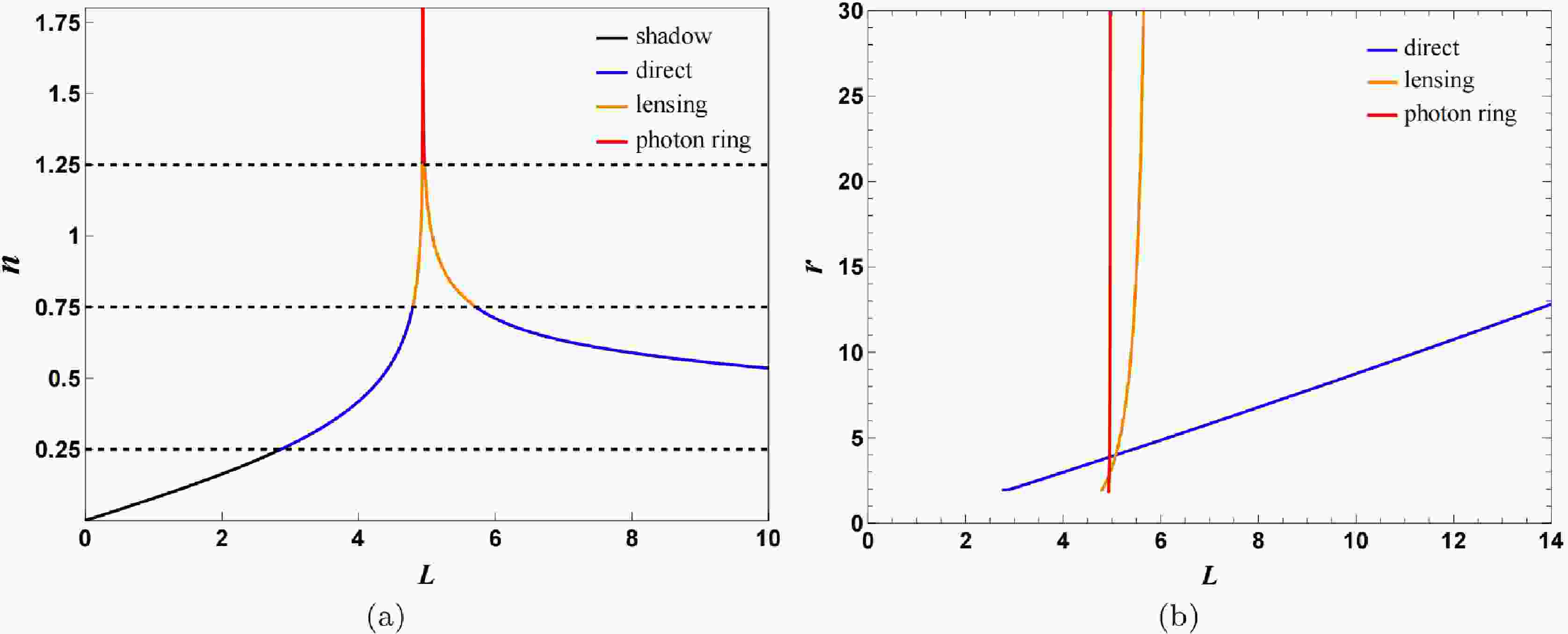 Figure 6. (color online) (a) Variation in the total number n with the angular momentum L. The black hole shadow satisfies the condition