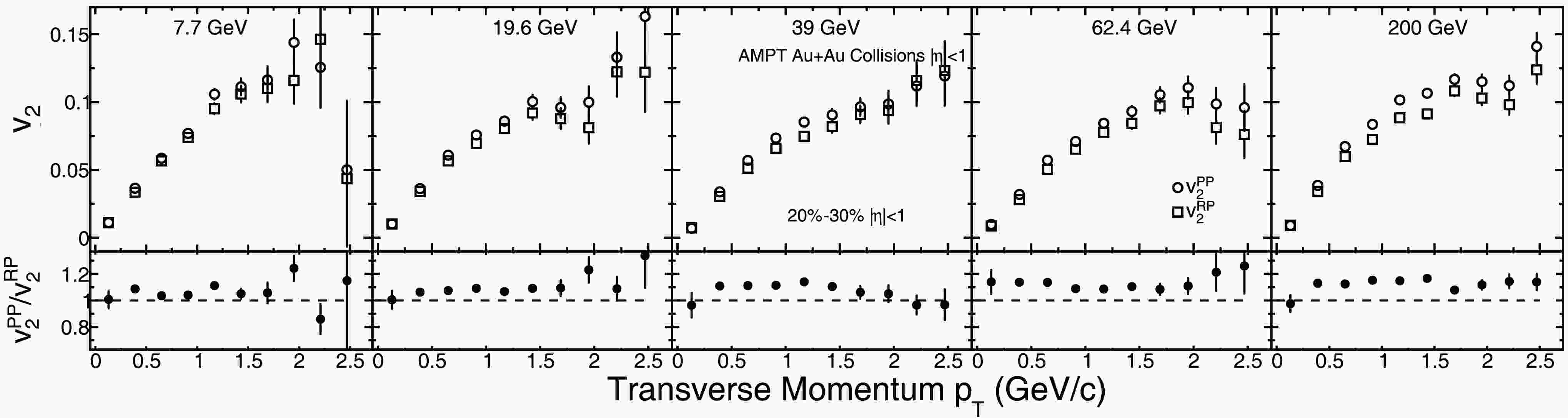 $ v_2 $ of charged hadrons relative to both the PP and RP using the AMPT model with the string melting version. Specifically, we show the transverse momentum ($ p_T $ ) dependence of$ v_{2}^{\text{PP}} $ and$ v_{2}^{\text{RP}} $ for charged hadrons across different collision centralities and collision energies. The ratio$ v_{2}^{\text{PP}} $ /$ v_{2}^{\text{RP}} $ is also analyzed as a function of$ p_T $ , and its centrality dependence is quantified using the linear fits to the$ p_T $ differential results. Furthermore, we investigate the effect of hadronic rescattering on the ratio at each collision energy. Finally, we provide a detailed discussion of the energy and centrality dependence of the$ v_2 $ ratio.Following the experimental analysis procedures [18], the collision centrality is determined from the reference multiplicity defined as the number of charged pions, kaons, and protons within the pseudorapidity range