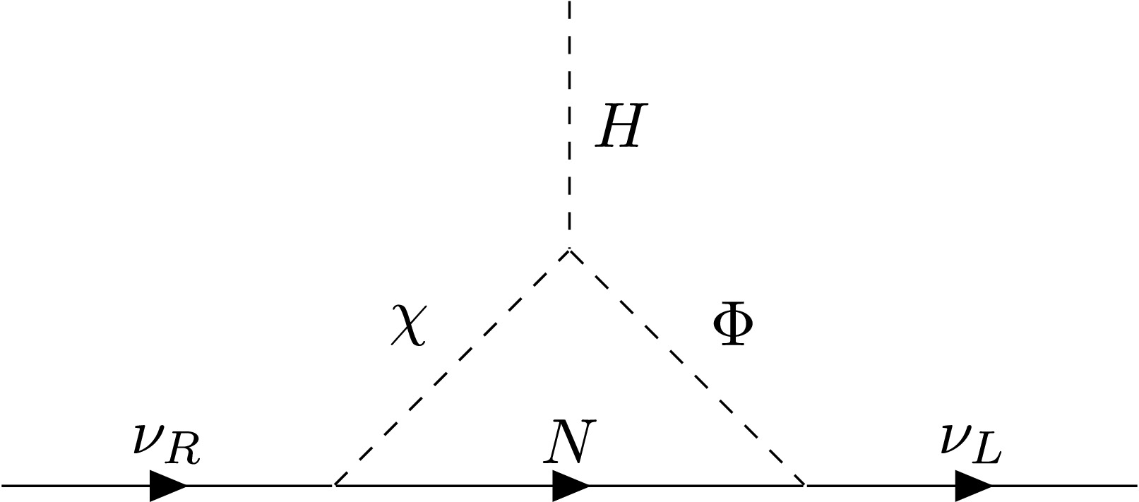 $ \begin{aligned} - {\cal{L}}_{\rm new} \supset \left(y_\Phi \overline{F_L} \tilde \Phi N + y_\chi \overline{\nu_R} \chi N + {\rm h.c.} \right) + m_N \overline{N} N, \end{aligned} $