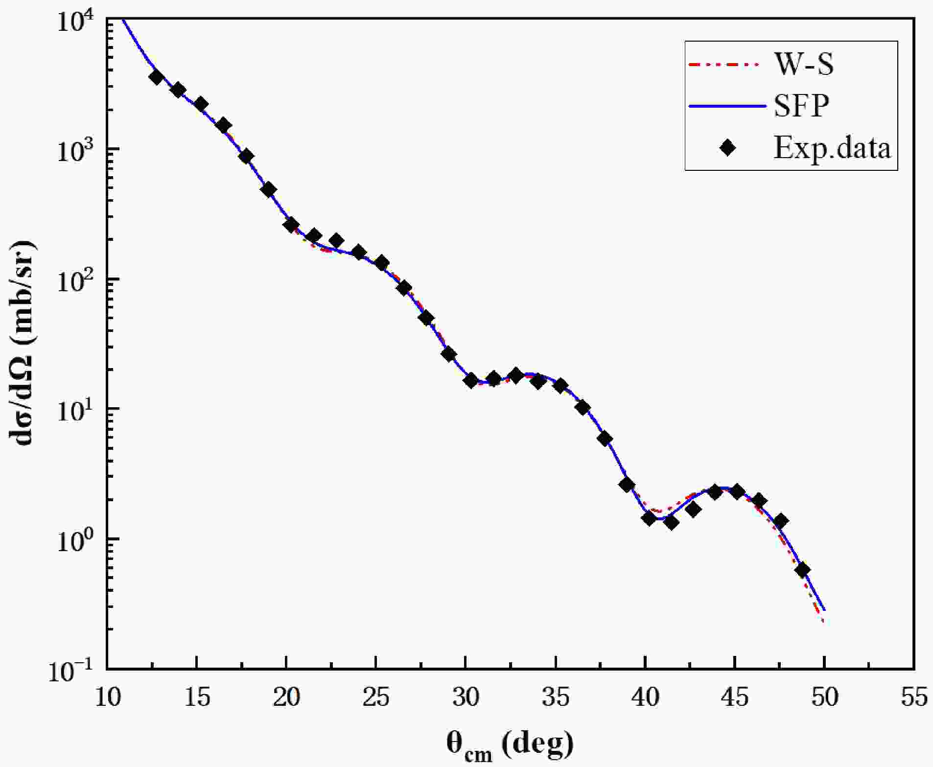 Figure 3. The fitting results of 26Mg(7Li,7Li) elastic scattering at 42 MeV. The black solid diamonds represent the experimentally measured elastic scattering angular distribution, and the blue solid line and red dashed line represent the results obtained using the SFP and the Woods-Saxon potential for fitting, respectively. The uncertainties are too minor to be discernible in the plot.
