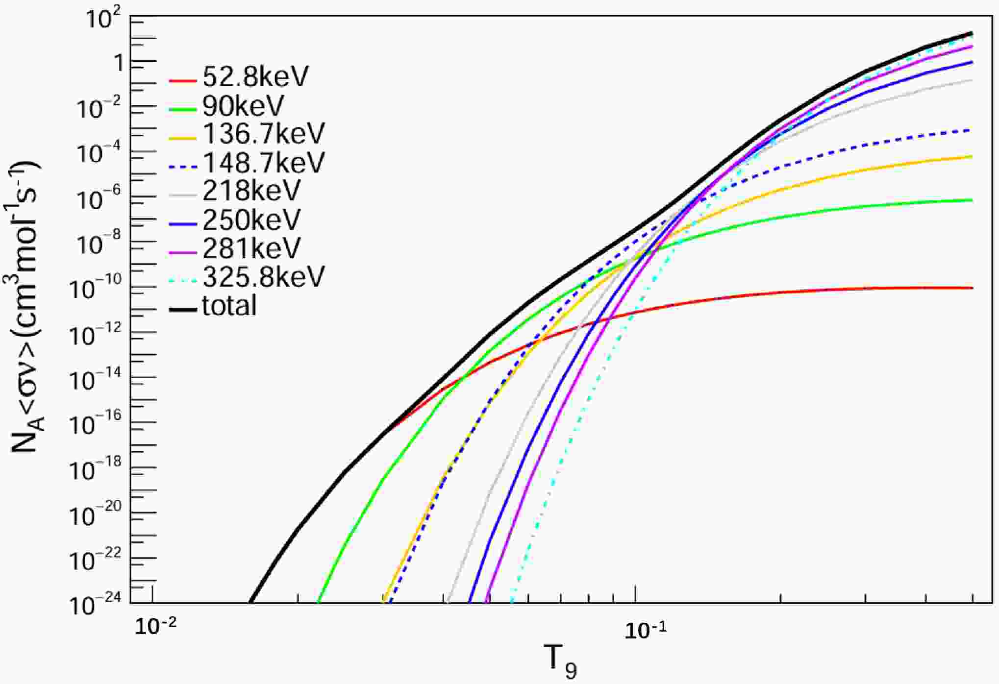 (5) $ N_A $ is Avogadro's constant, k is Boltzmann's constant,$ \mu $ is the reduced mass, T is the stellar temperature,$ E_R $ is the resonance energy, and$ \omega\gamma $ is the resonance strength. The resonance strength for narrow resonances is calculated as follows:$ \omega\gamma_i=\frac{2J_i+1}{(2J_p+1)(2J_t+1)}\frac{\Gamma_p\Gamma_{\gamma}}{\Gamma_{{\rm{total}}}}, $