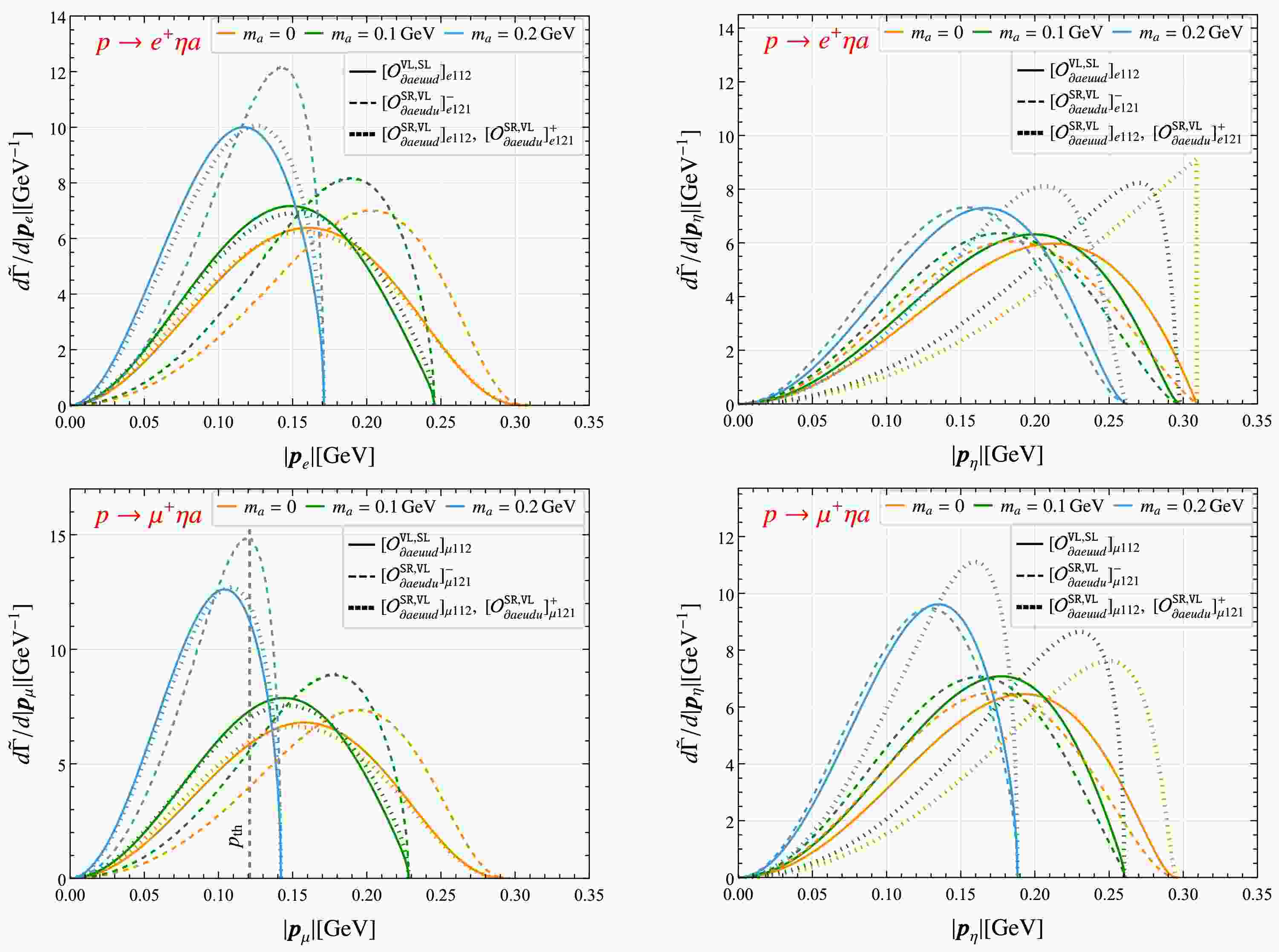 $ {\rm{SU}}(3)_{\rm{c}}\otimes {\rm{U}}(1)_{\rm{em}} $ . To calculate the hadronic matrix elements, a systematic approach is through the chiral perturbation theory (ChPT) framework [43−45] by matching the quark-level operators onto their hadronic counterparts. For all relevant nucleon decay operators in the LEFT, their leading-order chiral matching has been systematically established in [42, 46, 47] by requiring that the hadron-level operators share the same chiral and Lorentz transformation properties as their quark-level counterparts. Following these works, we decompose all aLEFT operators into irreps under the chiral group and determine the relevant spurion fields stemmed from the aLEFT interactions. By substituting these spurion fields into the matching results in [42] and expanding to the appropriate order in pseudoscalar meson fields, we obtain the desired hadron-level BNV operators. Together with the standard baryon ChPT interactions [48, 49], we calculate the amplitudes and decay widths for both octet baryon two-body decays and nucleon three-body decays involving an ALP. To extract more meaningful information from experimental data, we also analyze the momentum distributions of the final-state charged leptons and mesons in nucleon three-body decays.After establishing the theoretical framework for nucleon decays involving an ALP, we examine the experimental constraints on the relevant aLEFT interactions. Given the limited experimental search for those exotic decay modes, we constrain these channels by reanalyzing the existing data from proton decay searches conducted by the Super-K experiment [50−54]. We simulate the proton decay processes using the analytical decay distributions by accounting for the detector’s resolution and efficiency, and compare the results with Super-K data to extract lower bounds on the partial lifetime (
