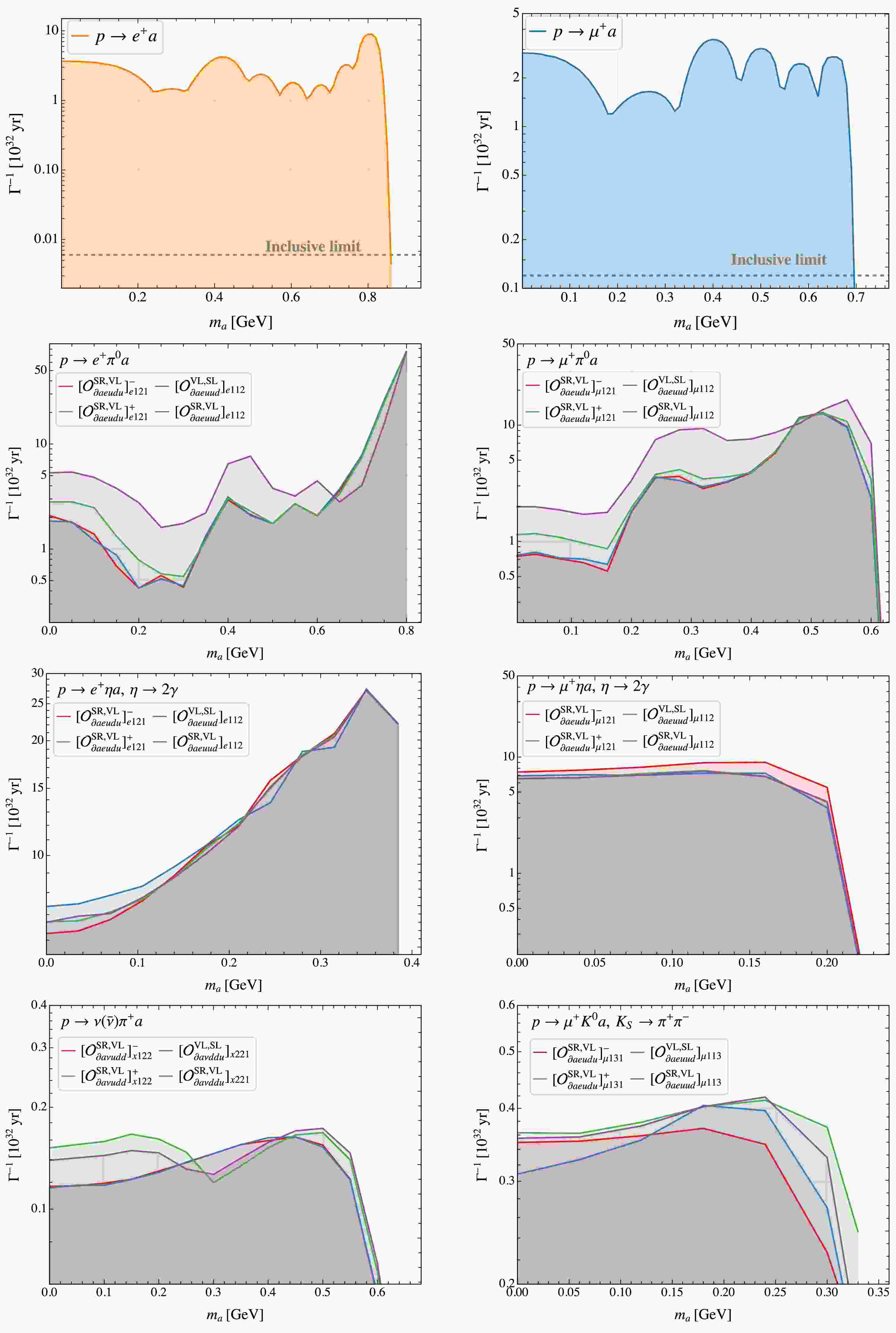 $ {\rm{SU}}(3)_{\mathtt{L}}\otimes {\rm{SU}}(3)_{\mathtt{R}} $ of the light$ u,\; d,\; s $ quarks, these dim-8 operators can be classified into three irreducible representations (irreps) and their chiral partners:$ {\bf{8}}_{ \mathtt{L}( \mathtt{R})} \otimes {\bf{1}}_{ \mathtt{R}( \mathtt{L})} $ ,$ {\bf{3}}_{ \mathtt{L}( \mathtt{R})} \otimes \bar{{\bf{3}}}_{ \mathtt{R}( \mathtt{L})} $ , and$ {\bf{3}}_{ \mathtt{L}( \mathtt{R})} \otimes {\bf{6}}_{ \mathtt{R}( \mathtt{L})} $ . Only 8 operators in the first two usual irreps were considered in [12], whereas the remaining 12 operators associated with the new chiral irreps$ {\bf{3}}_{ \mathtt{L}( \mathtt{R})} \otimes {\bf{6}}_{ \mathtt{R}( \mathtt{L})} $ were discarded as sub-leading contributions. Recently, we have found that the operators in the new chiral irreps can contribute to nucleon decays at the same leading chiral order as the other two [42]. Moreover, processes that change isospin by 3/2 units, such as$ n\to \pi^+ e^- a $ and$ n\to \pi^+ \mu^- a $ , can only be mediated by operators belonging to the irreps$ {\bf{3}}_{ \mathtt{L}( \mathtt{R})} \otimes {\bf{6}}_{ \mathtt{R}( \mathtt{L})} $ due to their unique flavor and Lorentz structures. Motivated by these considerations, in this work, we will systematically investigate the nucleon decays involving an ALP based on the complete set of all 20 BNV aLEFT operators.We begin by collecting the relevant dim-8 BNV aLEFT operators involving an ALP, a SM lepton, and three light quark fields, which are invariant under the QCD and QED symmetries