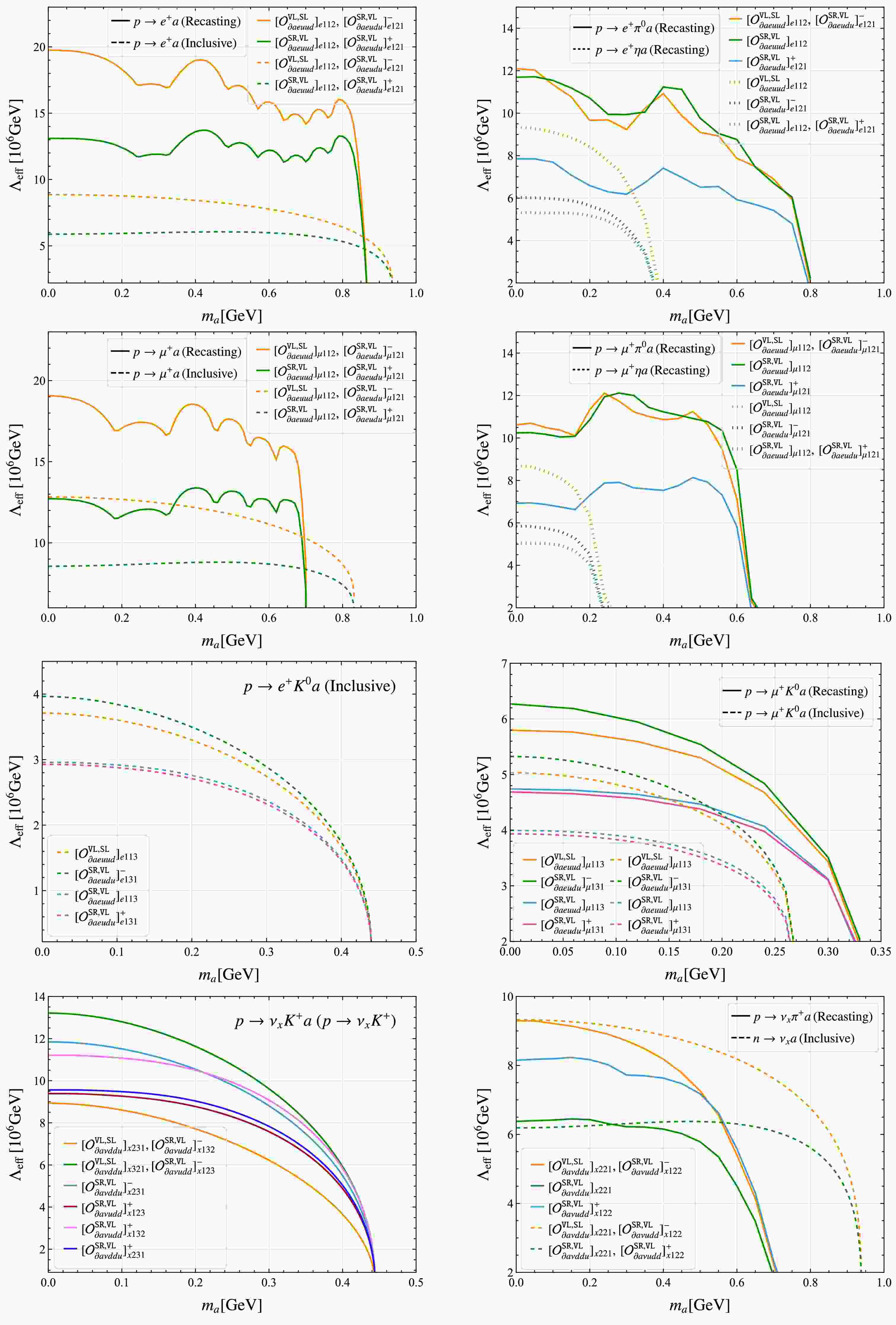 $ \Delta B = |\Delta L| = 1 $ processes, the required lowest dimensional aLEFT operators must contain three quark fields and one lepton field. We assume that the interactions preserve the shift symmetry in the axion field a, which results in the ALP field appearing only through its derivative,$ \partial_\mu a $ .2 Consequently, the relevant leading-order operators appear at dim 8 and take the form,$ lqqq\partial a $ .A complete set of those dim-8 operators was recently constructed in [41]. However, to facilitate chiral matching in the subsequent parts, we will construct a slightly modified operator basis. Denoting the SM charged lepton chiral fields as