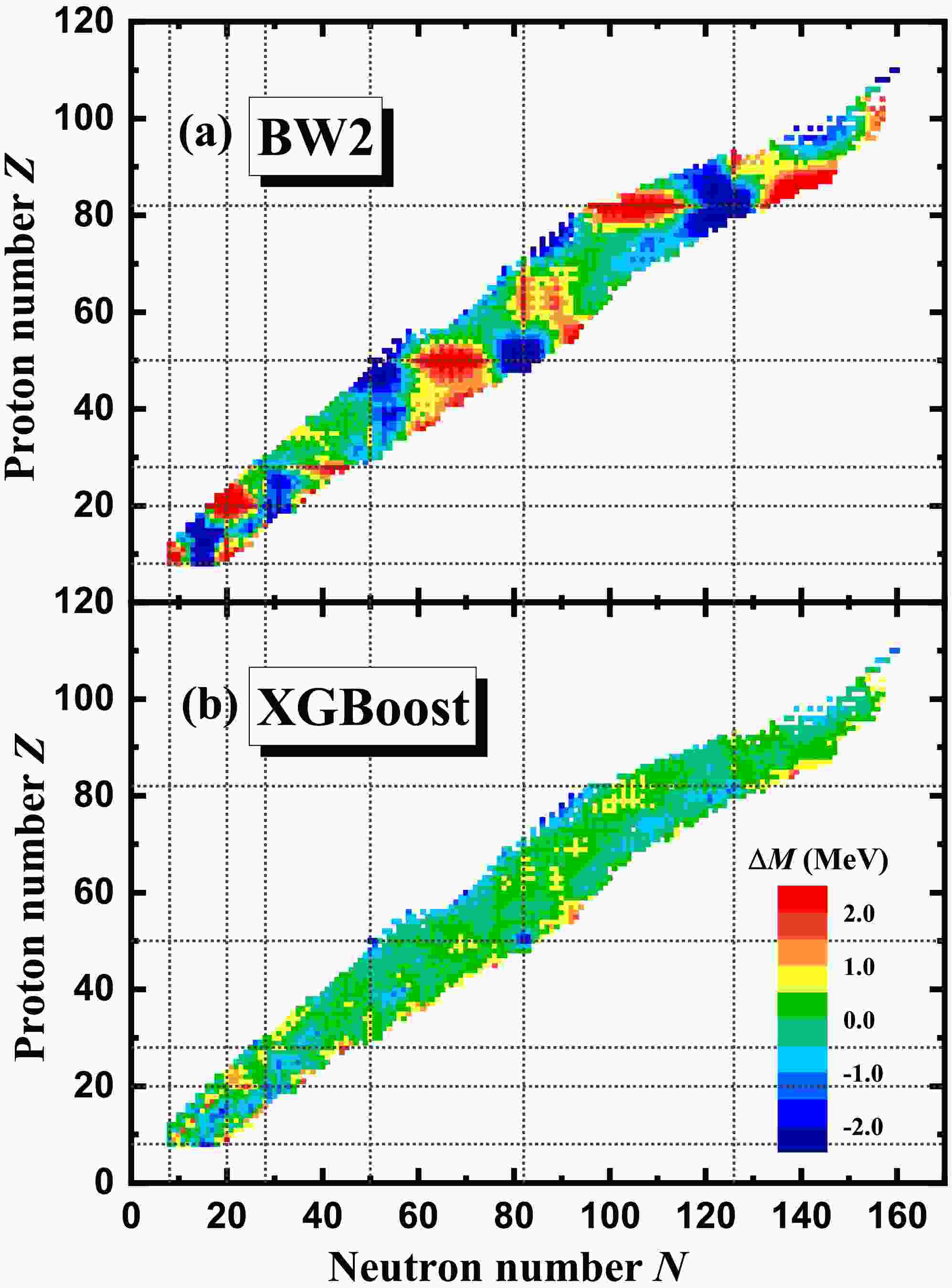 Figure 1. (color online) Mass differences between the experimental data in AME2020 [12] and theoretical predictions. Panels (a) and (b) correspond to the BW2 and XGBoost mass models, respectively.