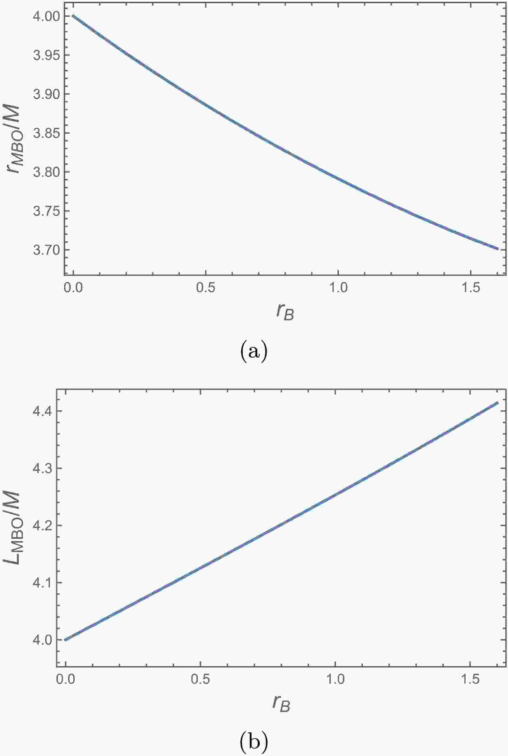 $ r_B $ . (b) MBO angular momentum versus$ r_B $ . Radius decreases while angular momentum increases with$ r_B $ .The ISCO, determined by Eq. (19), also depends on